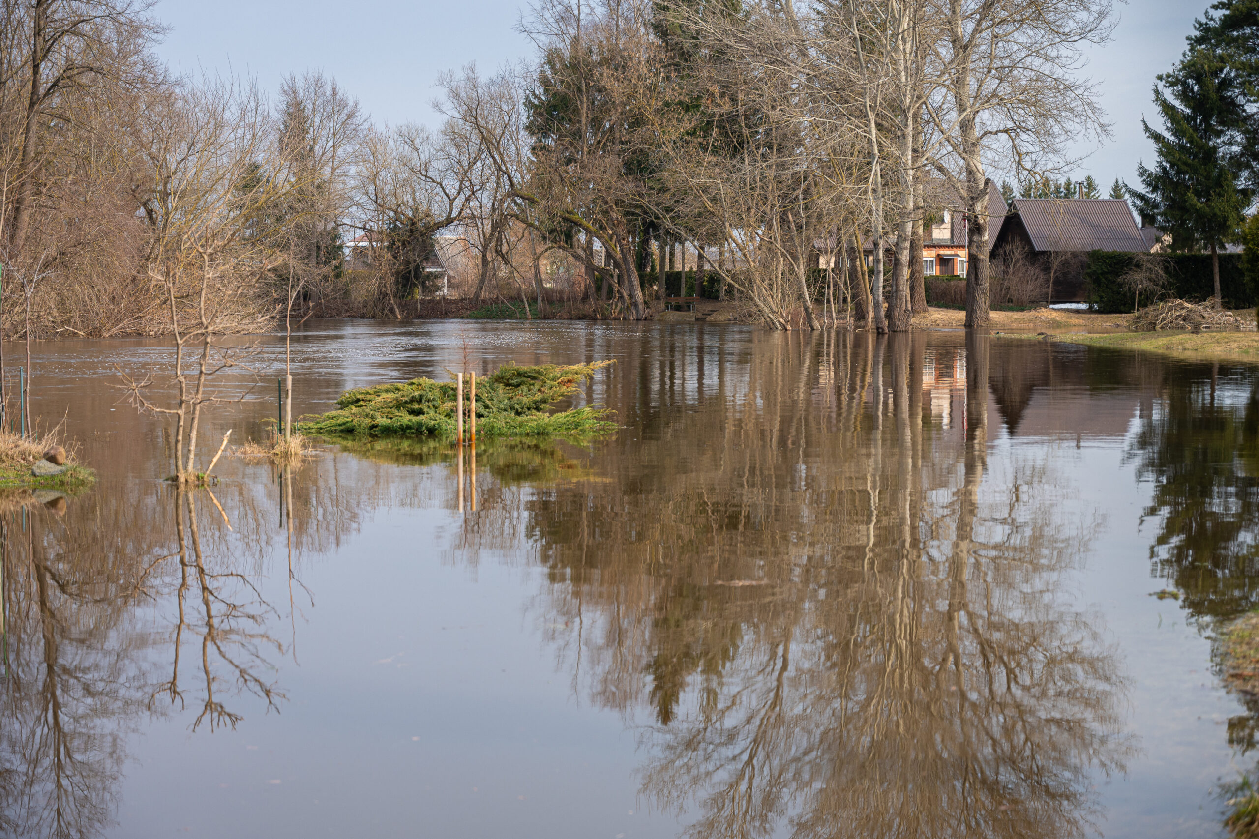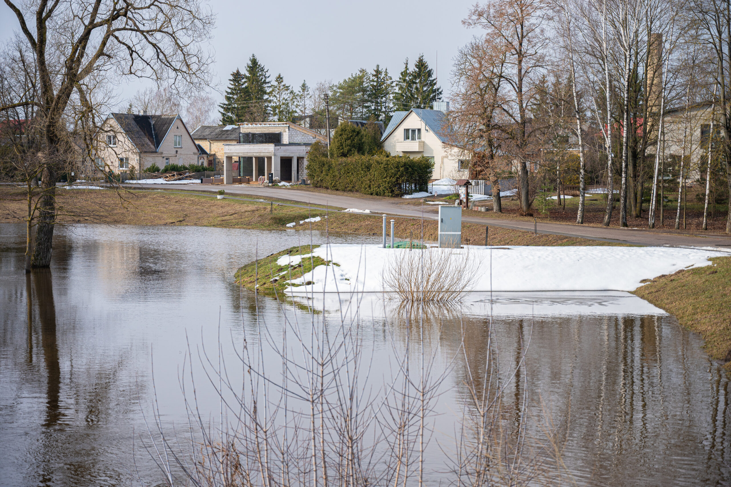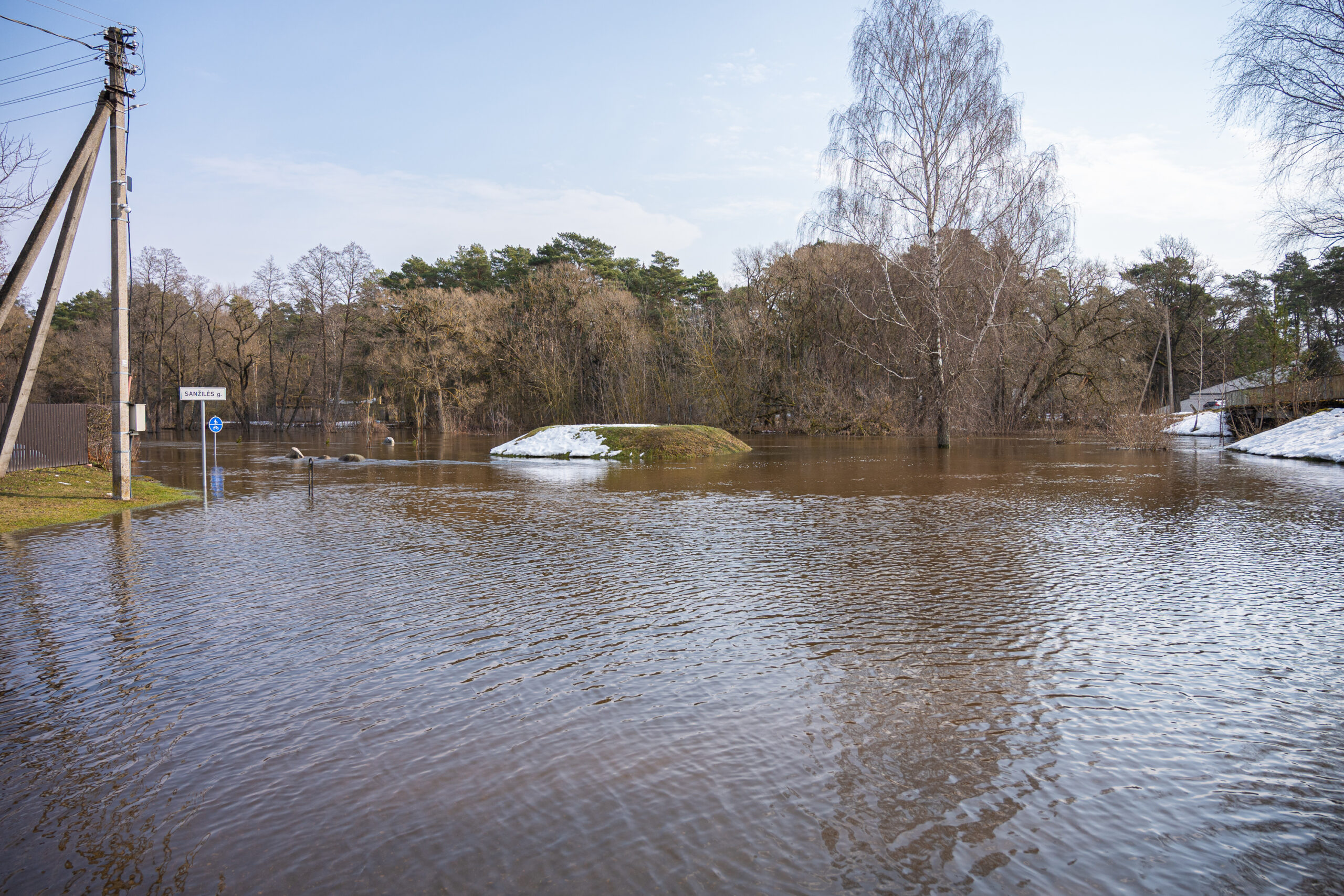 Išsiliejusi Sanžilė apsėmusi pievas, o prie maudyklų esančios persirengimo kabinos atrodo tarsi stovėtų ežero viduryje.