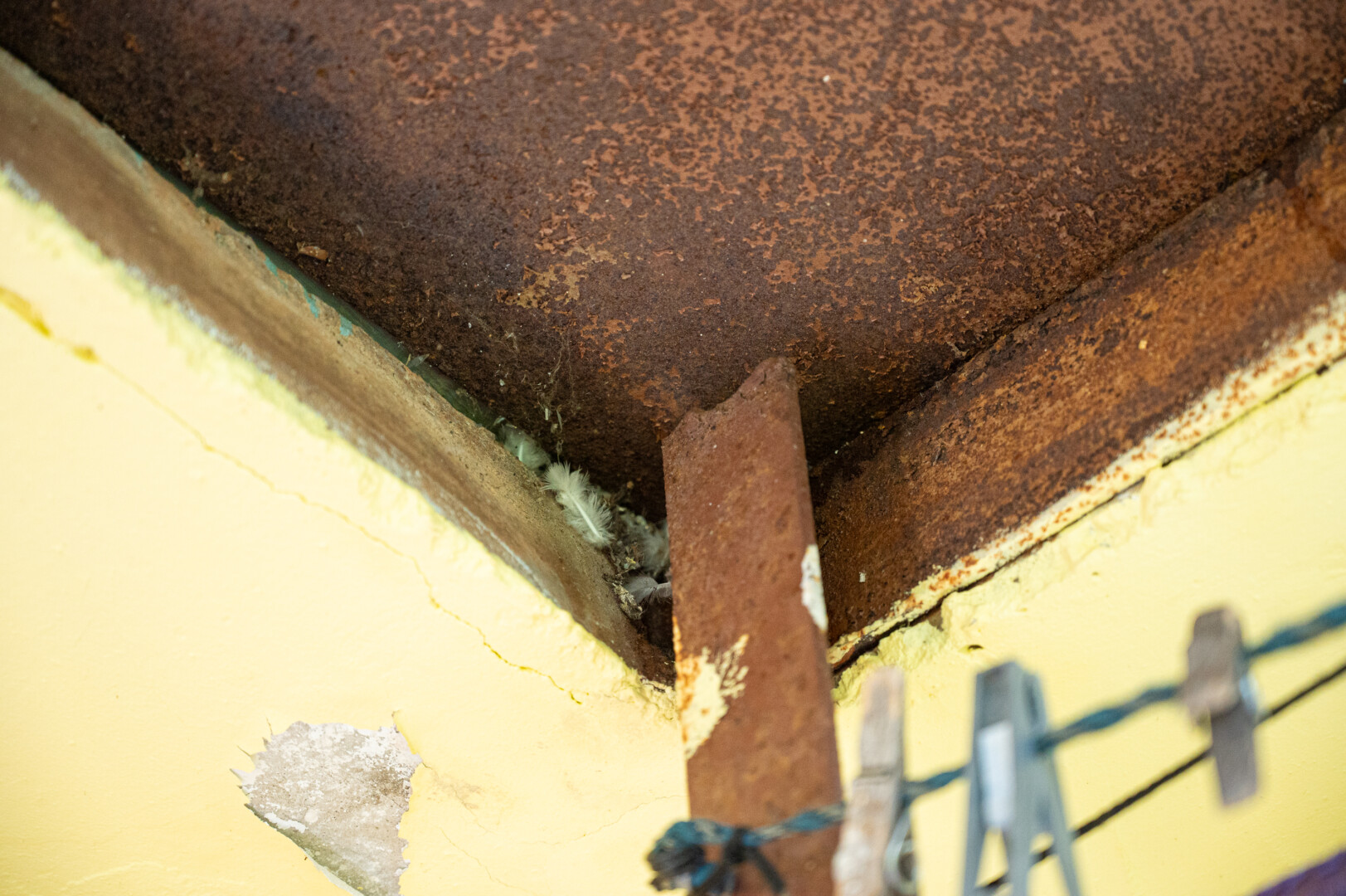 Panevėžietės kantrybė trūko, kai iš virš jos esančio Savivaldybės buto balkono ėmė tekėti ne tik karvelių fekalijas nuplovęs lietaus vanduo, bet ir kirmėlės. P. Židonio nuotr.