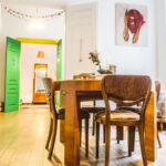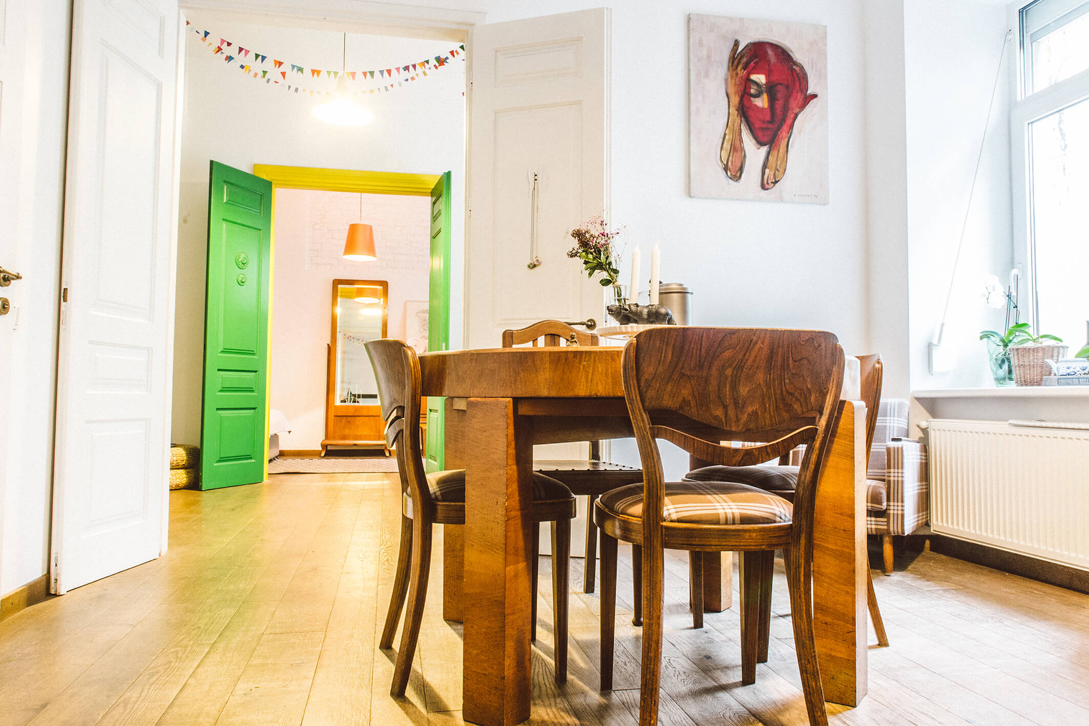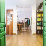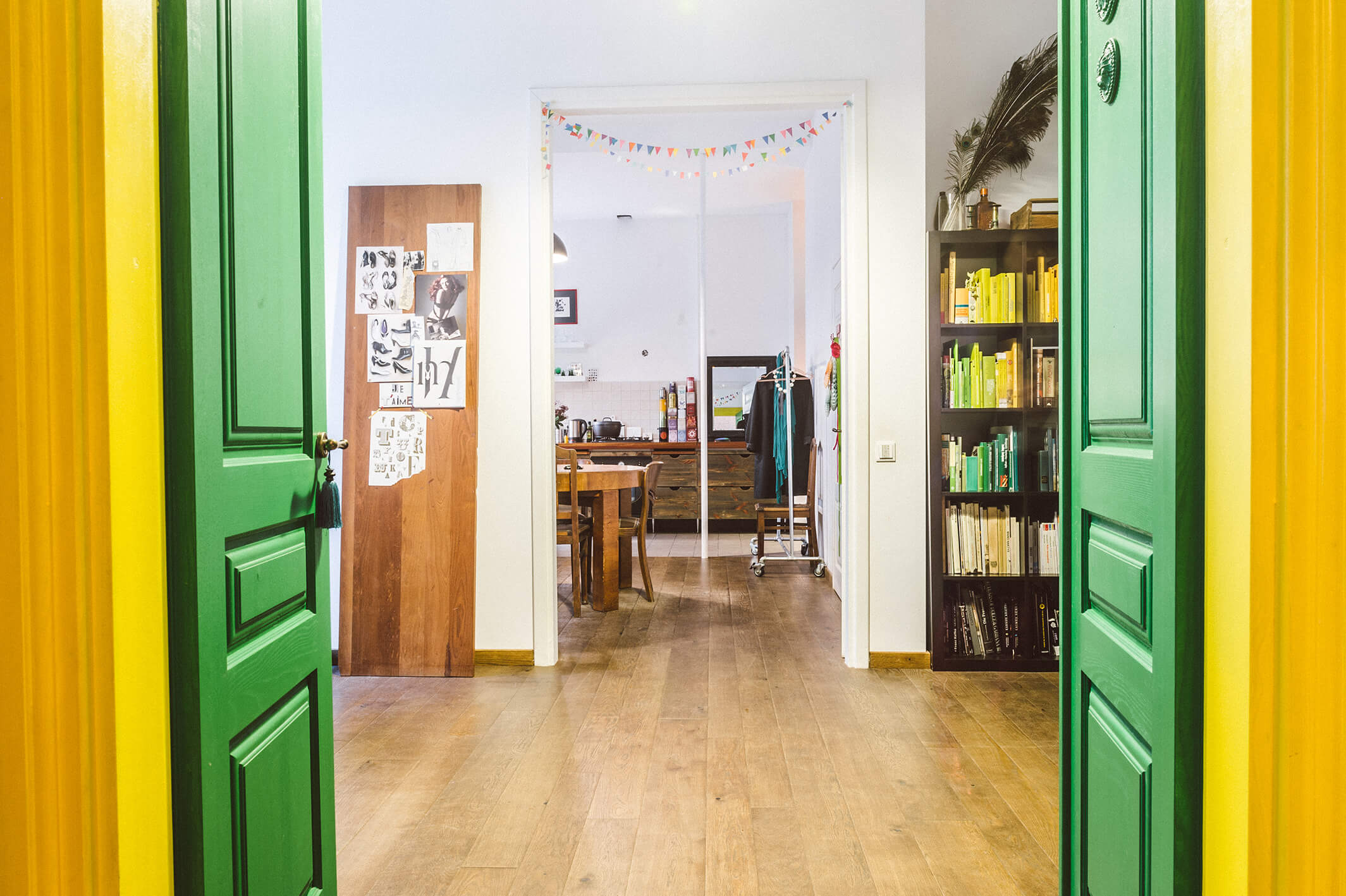 Durys – vienas charakteringiausių šio būsto akcentų. Atkurtos pagal senovinius brėžinius, dvivėrės baltos durys veda iš virtuvės ir valgomojo zonos į svetainės ir darbo kambarį. Iš šio į miegamąjį veriasi taip pat dvivėrės, tačiau ryškia žalia spalva, kontrastuojančia su geltona stakta, nudažytos durys.