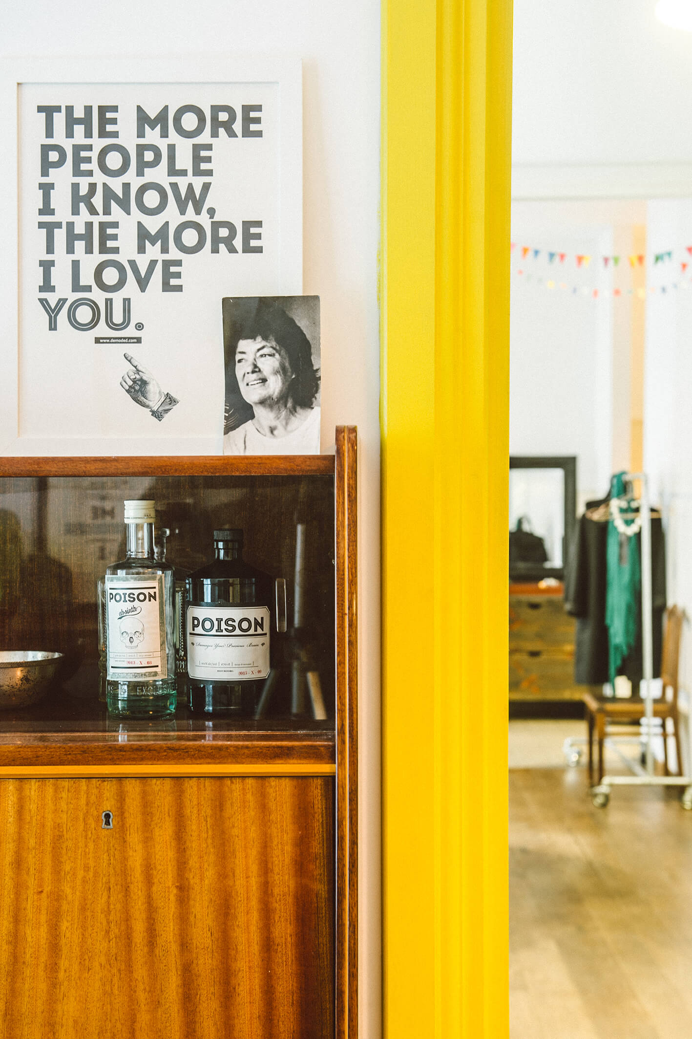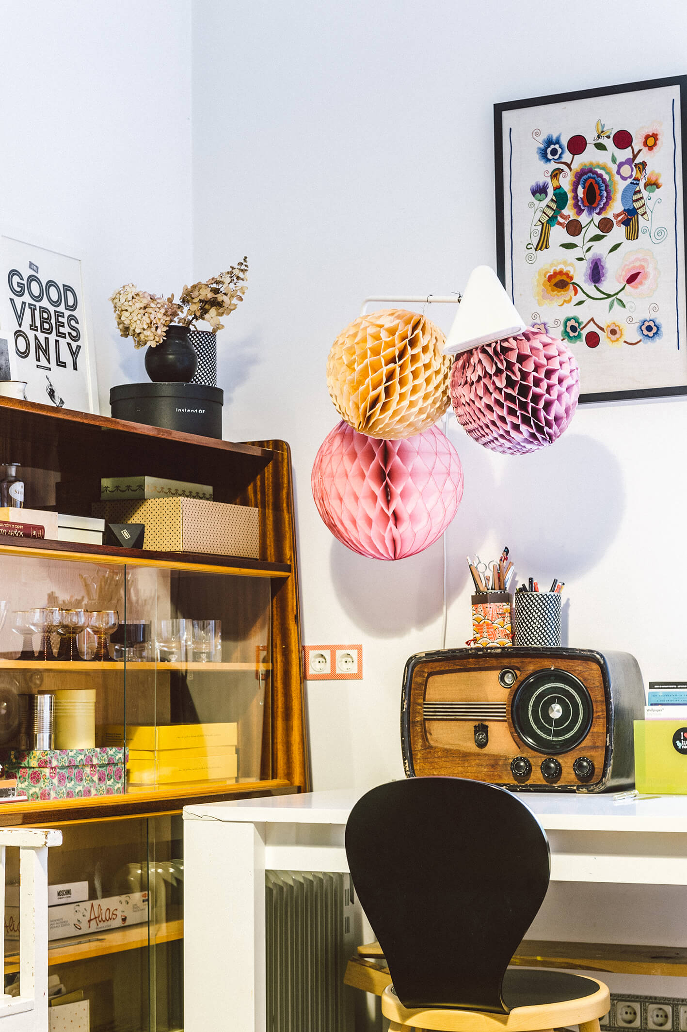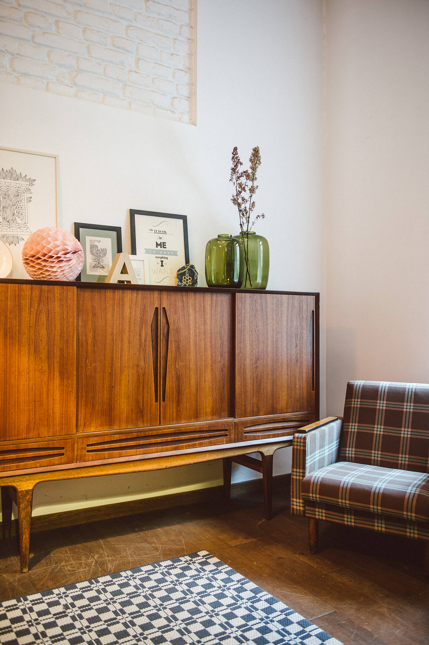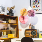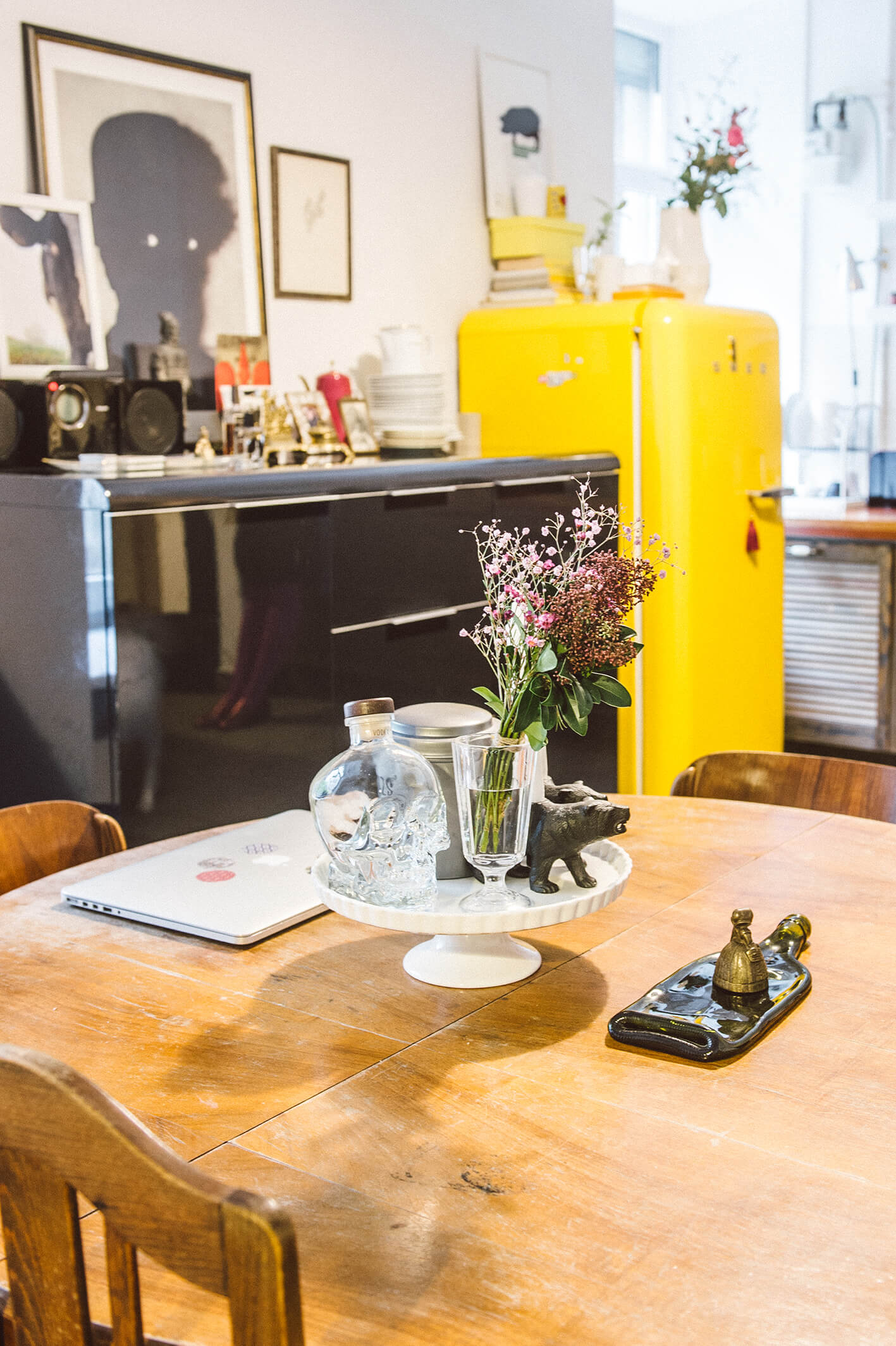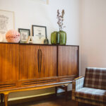 Baldai į šiuos namus surinkti skirtingais būdais: šis tas naujo, šis tas pirkto sendaikčių ar antikvariato parduotuvėse, šis tas dovanota. Pavyzdžiui, dvi stilingas mid-century modern laikotarpio indaujas padovanojo grafikos dizainerės mamos, teatro dailininkės ir fotografės Aleksandros Jacovskytės draugė. Dovanų gautas ir masyvus apvalus stalas. O darbo kampelyje pūpsantis senovinis radijo imtuvas – palikimas: jis priklausė dydai – taip Marija su broliu vadindavo senelį.