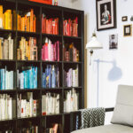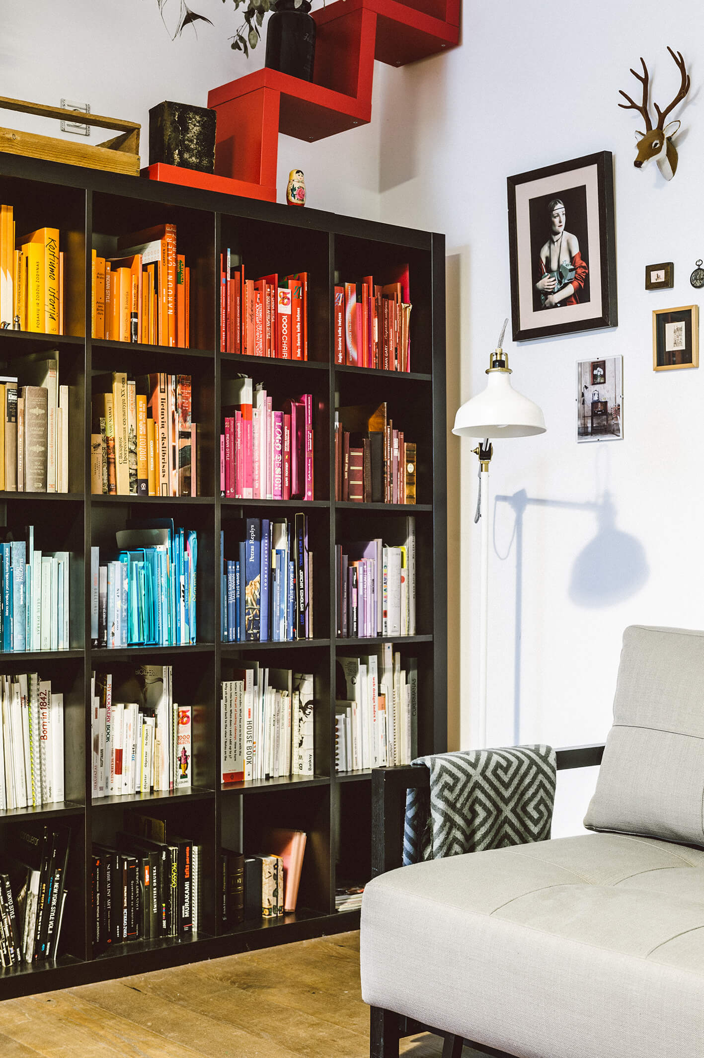 Spalvingų inkliuzų čia esama ir daugiau. Juoda knygų lentyna akį traukia visa viršelių spalvų vaivorykšte. „Jei nesi vizualistas, toks būdas laikyti knygas netinkamas. O man, vos išgirdus knygos pavadinimą, iškart prieš akis iškyla jos viršelis, todėl ir rasti taip laikomas knygas yra lengva“, – šypteli Marija.