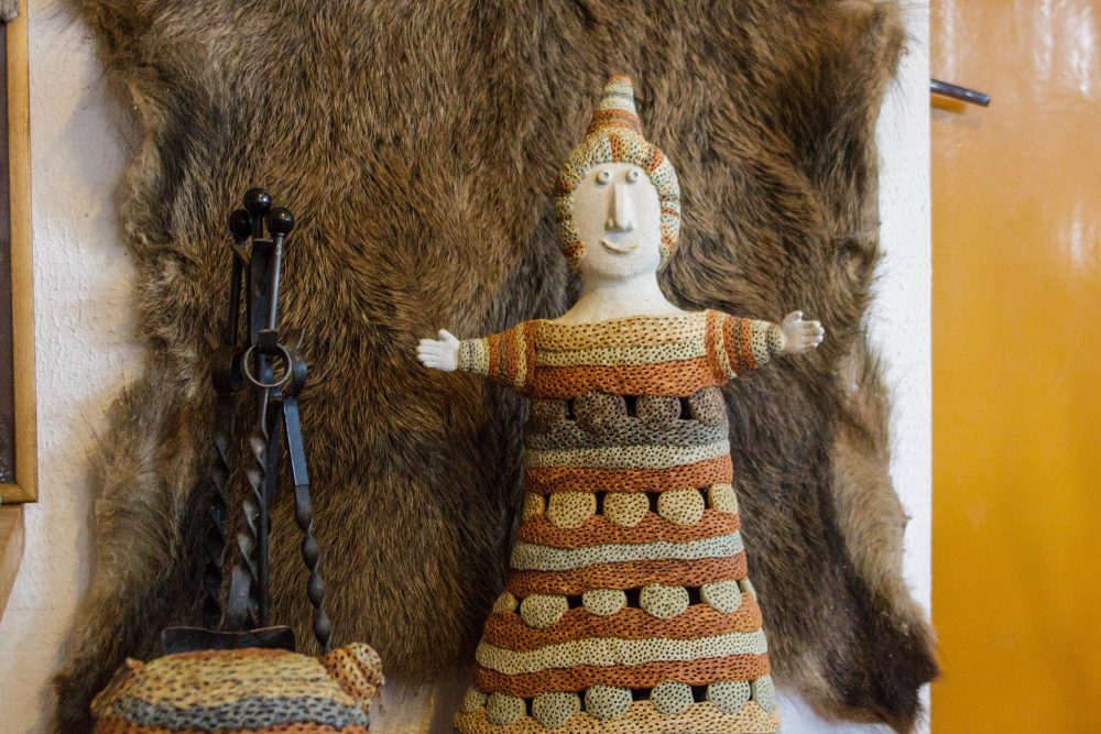 Nuolat kuriančios menininkės skulptūros išsibarsčiusios ne tik prie namų ir sode. Keramika alsuoja visas N. Čiukšienės būstas: šeimininkės rankų paliesto molio kompozicijos puošia sienas, grindis, kitus paviršius.