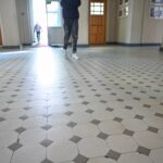 Pirmajame aukšte plytelių grindų danga – tokia pati, kokia buvo gimnaziją vos tik pastačius. Tos pačios išlikusios ir įspūdingos laiptų baliustrados.