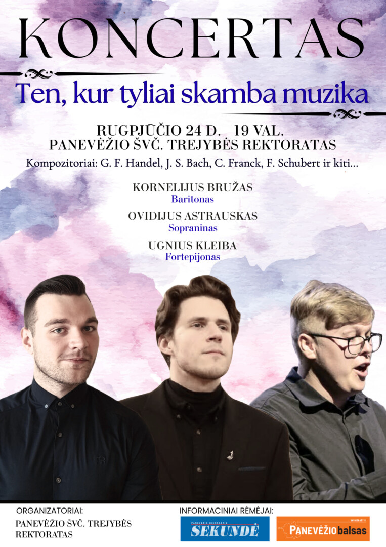 Panevėžio Švč. Trejybės rektorate rugpjūčio 24 dieną, 19 val. , vyks ypatingas koncertas, kuriame pasirodys talentingi jaunosios kartos operos atlikėjai – Kornelijus Bružas, Ovidijus Astrauskas ir pianistas Ugnius Kleiba.