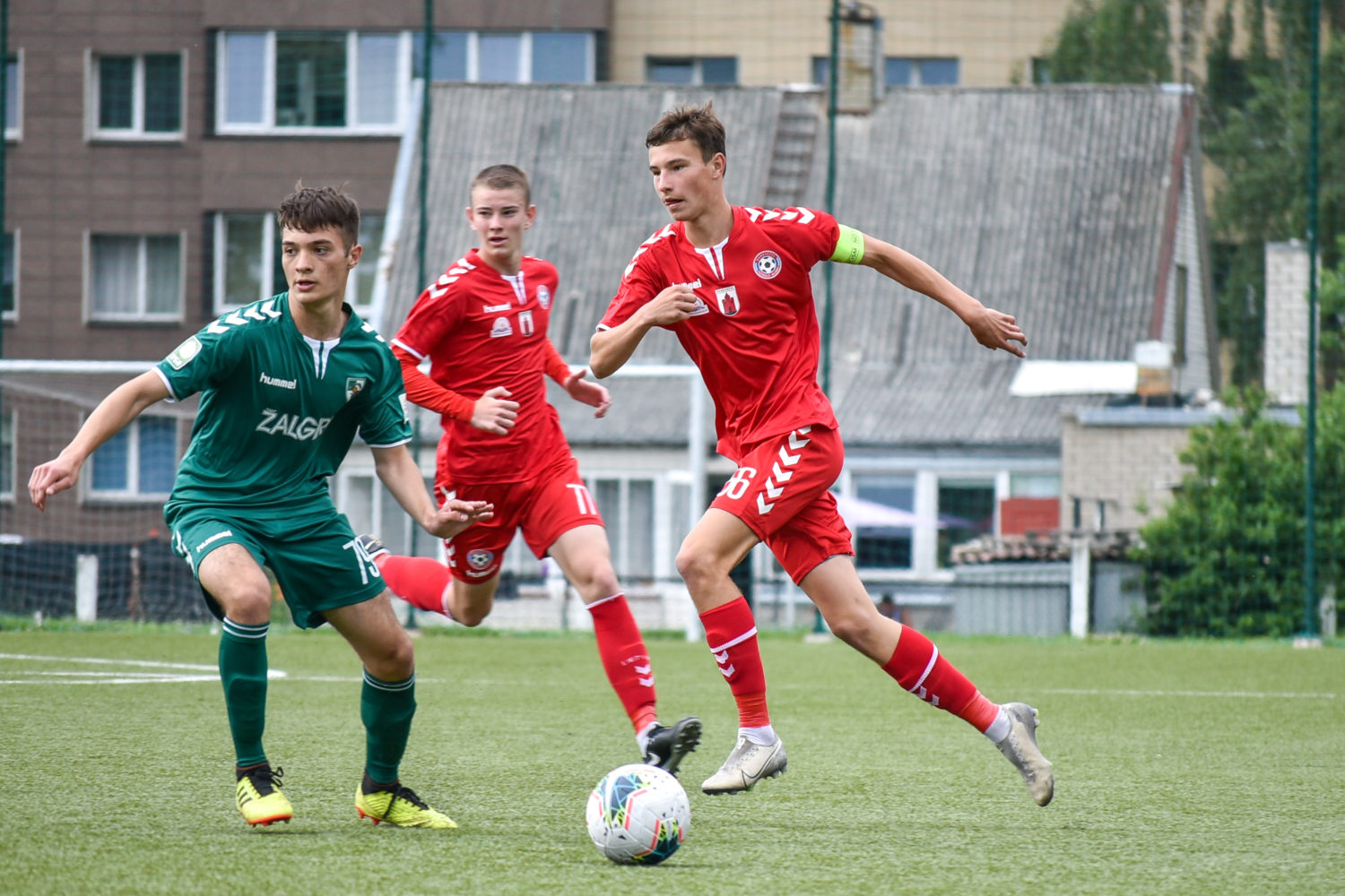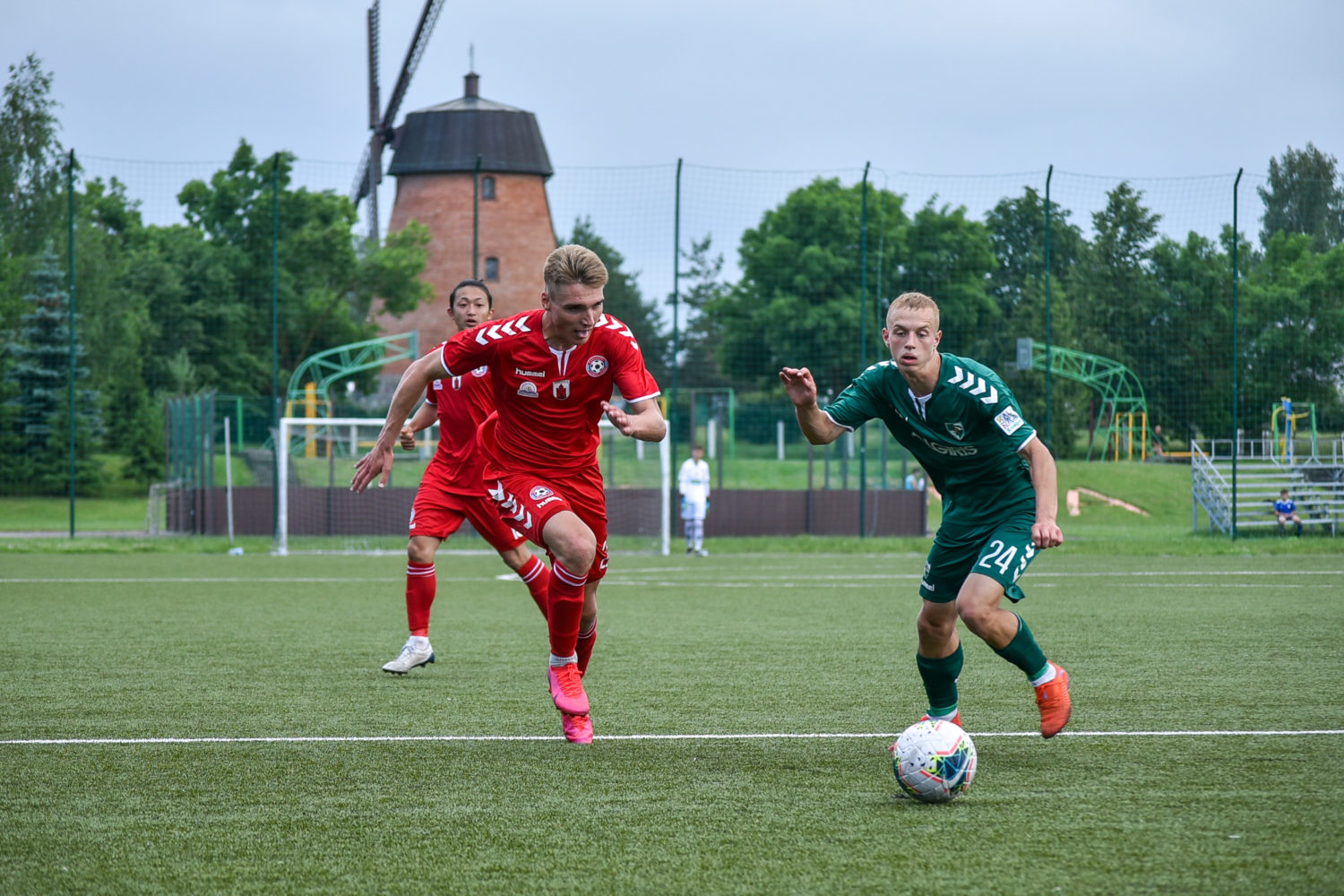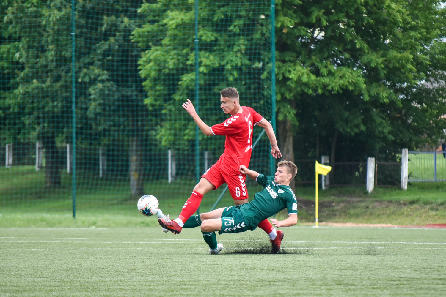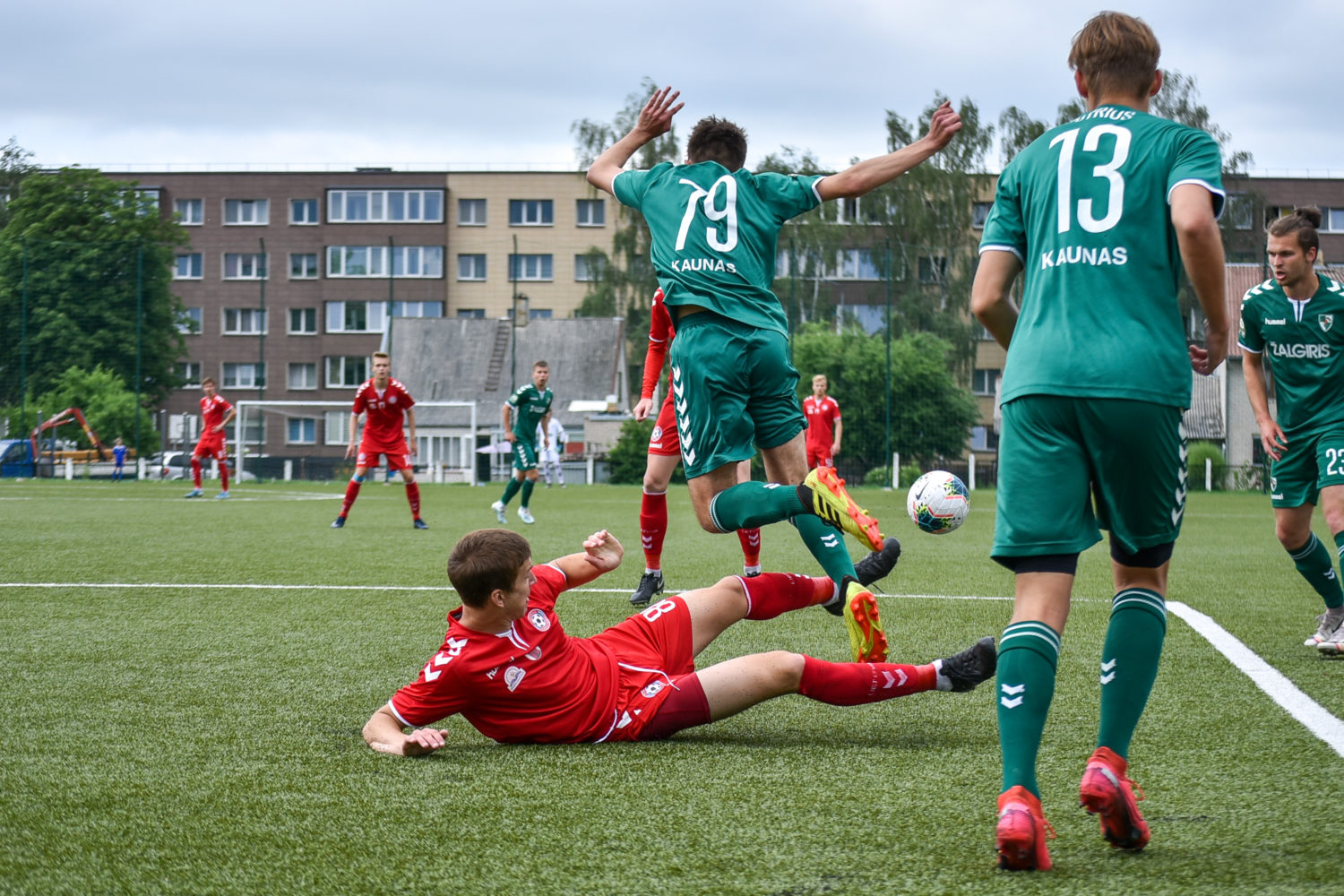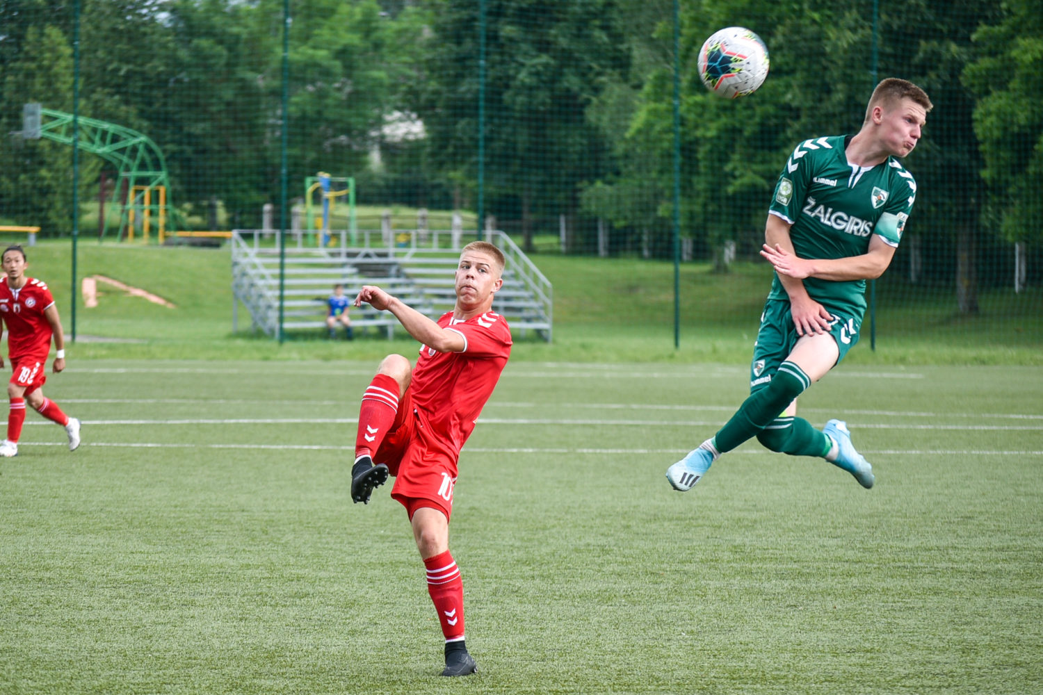 Paskutinę pirmojo kėlinio minutę svečių ekipos futbolininkui Domantui Vitkui iš arti pavyko nukreipti kamuolį į šeimininkų vartus ir poilsio komandos išėjo „Kauno Žalgirio B“ komandai pirmaujant rezultatu 2:1.