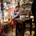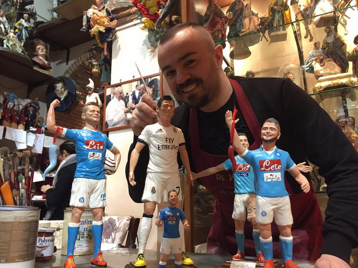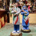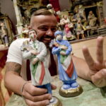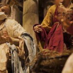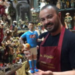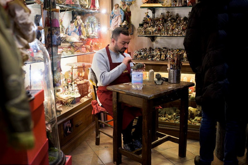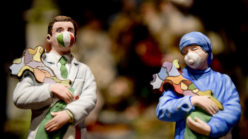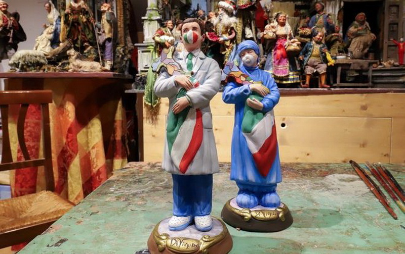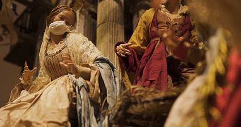 Džanio di Virgilijaus dirbtuvėse Neapolyje tikinčiųjų figūrėlės žvelgia į tik ką gimusį kūdikį Jėzų Kristų, veidus prisidengusios apsauginėmis kaukėmis.