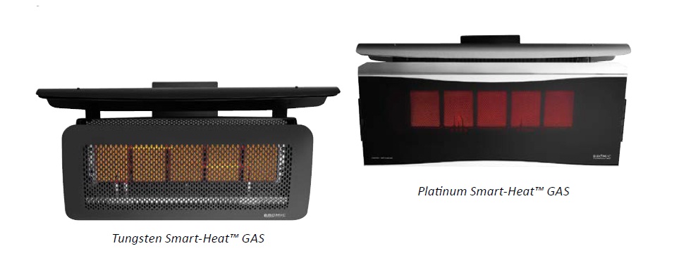 Platinum Smart-Heat™ Electric. 2300 W arba 3400 W galios versijos apšildo 6–10 m2 dydžio terasas. Nerūdijančio plieno korpusas, juodo arba balto stiklo paviršius. Šie šildytuvai montuojami prie sienos, lubų arba įleidžiami į lubas.