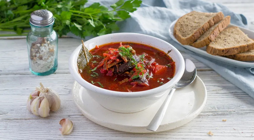 Reikės (8 porcijoms): 50–70 g džiovintų baravykų, 4 litrų vandens, 400 g burokėlių, 150 g morkų, 150 g svogūnų, 300 g bulvių, 600 g kopūstų, 4 šaukštų aliejaus, 1 šaukšto obuolių acto, 3–4 šaukštų pomidorų pastos, 150 g džiovintų slyvų be kauliukų, 1 lauro lapo, 6 juodųjų pipirų žirnelių, druskos, šviežiai maltų juodųjų pipirų; patiekti: grietinės, 4 petražolės šakelių.