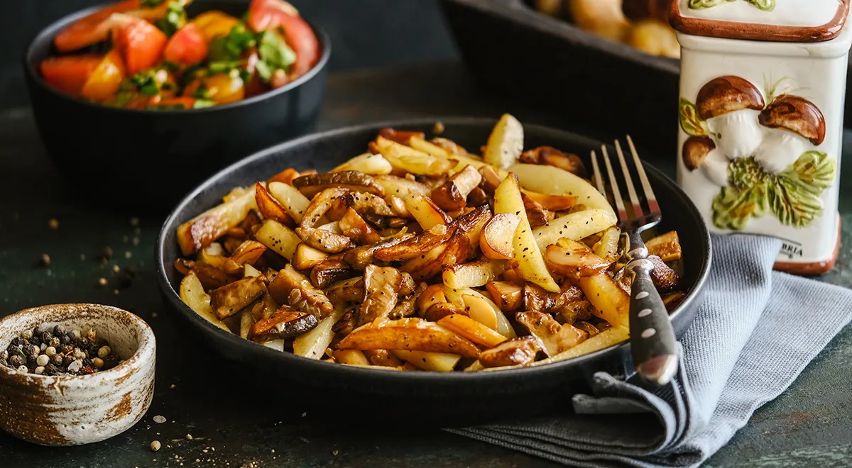 Reikės (4 porcijoms): 90 g džiovintų miško grybų, 600 g bulvių, 150 g svogūnų, 4–6 šaukštų aliejaus kepti, druskos, šviežiai maltų juodųjų pipirų.