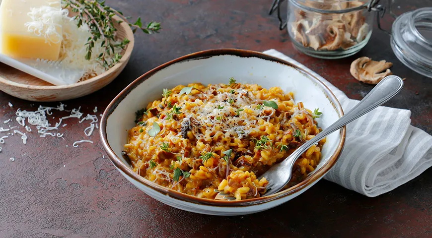 Reikės (4 porcijoms): 300 g ryžių rizotui, 90 g džiovintų miško grybų, 400 g svogūnų, 150 ml sauso baltojo vyno, 50 g sviesto, 30 ml alyvuogių aliejaus, 1 g šafrano, druskos, šviežiai maltų juodųjų pipirų; patiekti: sviesto, tarkuoto parmezano sūrio.