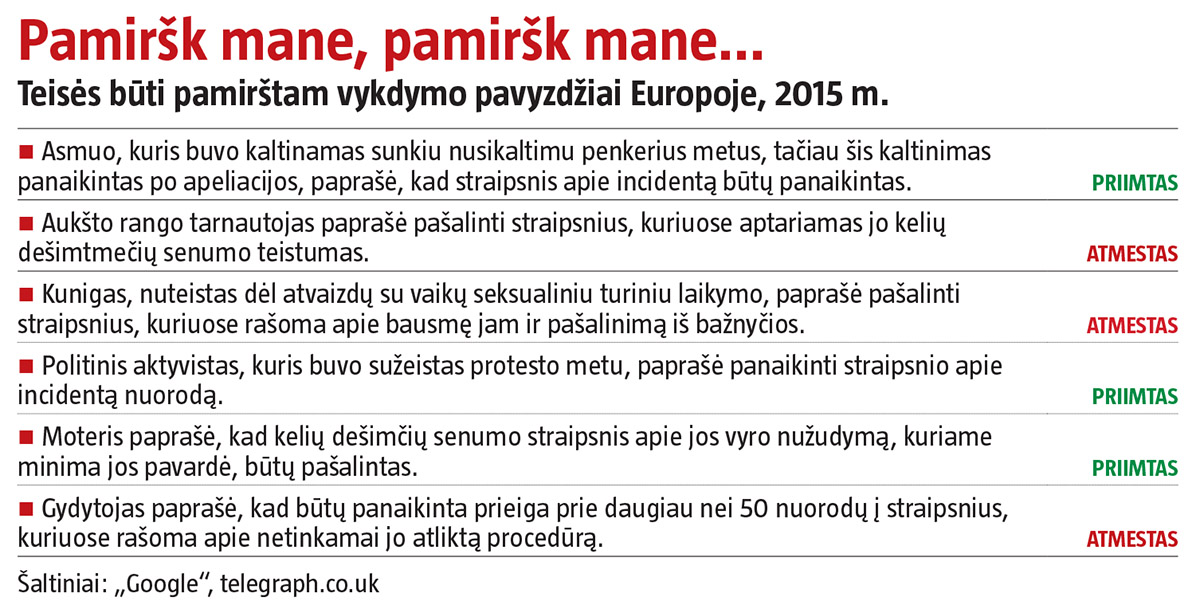 Pavyzdžiui, balandį „Google“ Londone pralaimėjo bylą, kurioje už tam tikrą nusikaltimą nuteistas verslininkas norėjo būti ištrintas iš paieškų. Panašioje byloje kito verslininko, padariusio sunkesnį nusikaltimą, prašymas nebuvo patenkintas.