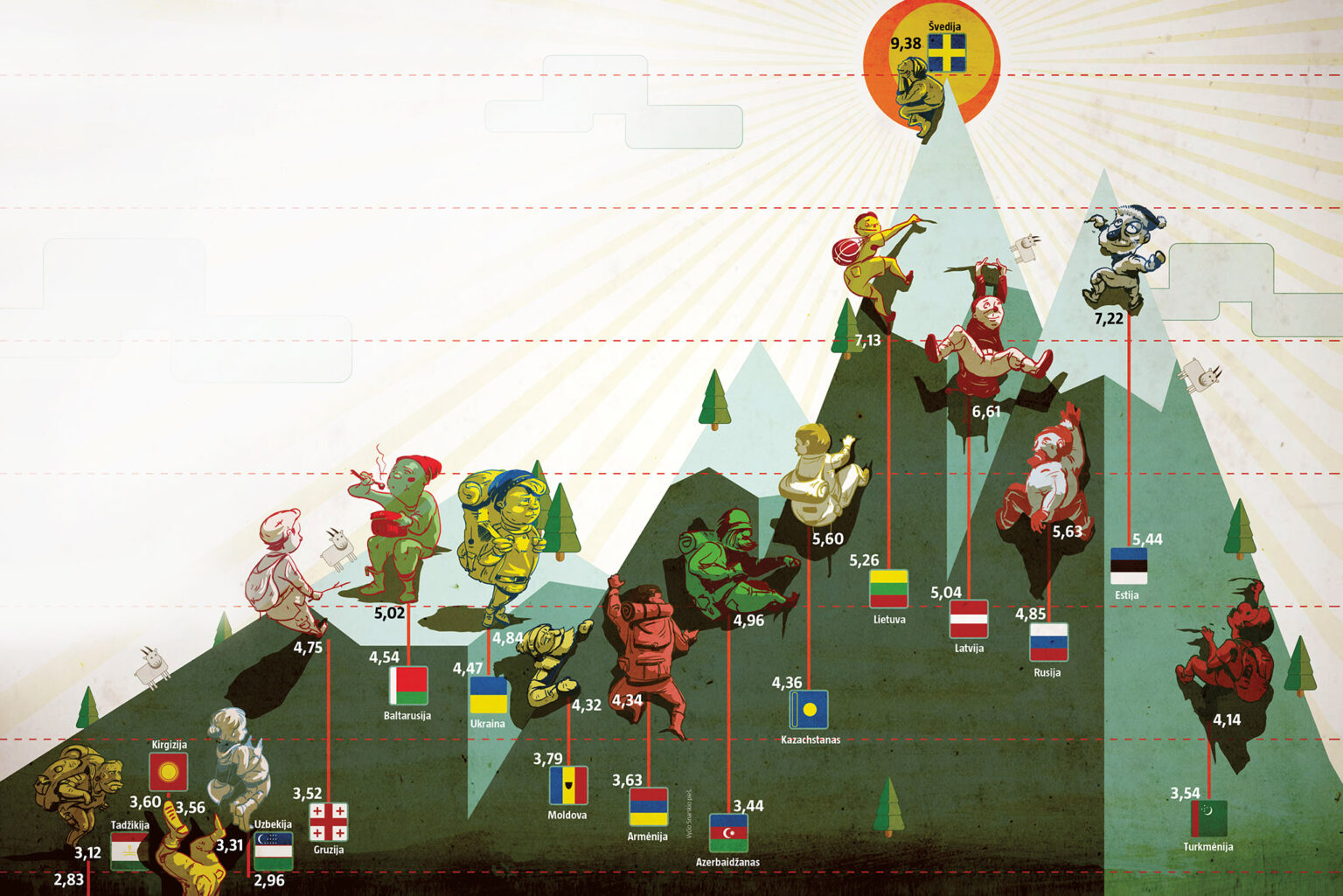 Apskaičiuojant šį indeksą, šalys lygintos visų pasaulio valstybių kontekste, o ne tarpusavyje. Maksimali riba siekia 10 balų, tačiau tokio rojaus žemėje nėra, kaip ir nėra šalies, kuri būtų pirma pagal visus kriterijus. Šio grafiko viršūnėje esanti Švedija yra viena lyderių, bet ne pirma – lyginti su ja pasirinkome dėl pažado „gyventi kaip švedai“.