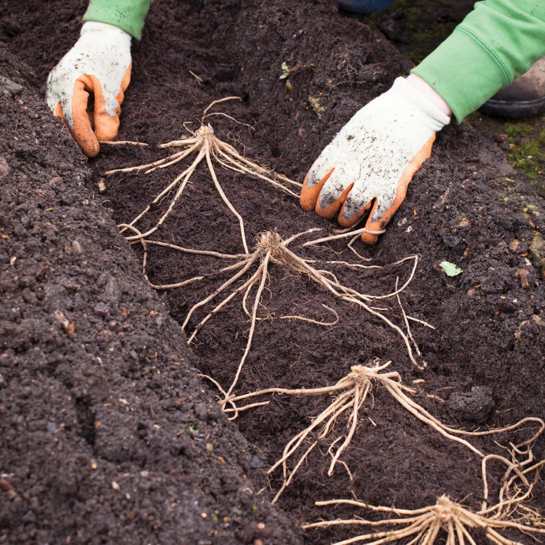 Kiekvienam augalui reikia nemenkos duobės – 30 cm gylio ir 40 cm skersmens. Ant dugno į krūvelę paberiama humuso, daigų šaknys patrumpinamos iki 3–4 cm ir išskleidžiamos aplink tą kalniuką. Tada užberiamos 5–7 cm žemių sluoksniu ir gausiai palaistomos. Kai vanduo susigeria, mulčiuojama sausomis žemėmis.