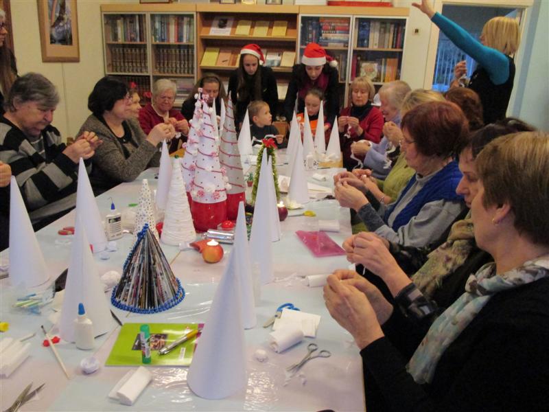 Parko bibliotekoje senjorų klubas „Pabūkime kartu“ surengė praktinį-edukacinį užsiėmimą „Su anūkais puošiame namus Kalėdoms“. Susirinkusiuosius mokė jau ne pirmąkart šioje bibliotekoje užsiėmimus vedanti „Minties“ gimnazijos technologijų mokytoja Jolanta Simonavičienė. Jai talkino pasipuošusios raudonomis nykštukų kepuraitėmis auklėtinės.
