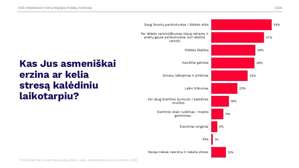 Pasak KOG rinkodaros ir komunikacijos mokslų instituto vadovės Eglės Šedbaraitės, naujausias tyrimas atskleidė, kad net 87 proc. žmonių dėl švenčių yra įsitempę, bet kiekvienas jų stresą patiria dėl skirtingų priežasčių – vieniems didžiausia našta yra dovanų paieška, kitiems – laiko trūkumas, valgio gaminimas ar didelės eilės parduotuvėse.