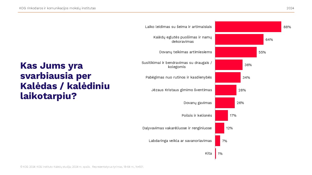 Pasak jos, antras svarbiausias Kalėdų akcentas – Kalėdų eglutės puošimas ir namų dekoravimas – taip atsakė 64 proc., trečioje vietoje – dovanų teikimas artimiesiems – 55 proc. (kad jas labiau mėgsta gauti, atsakė 26 proc. apklaustųjų), ne mažiau svarbus bendravimas su draugais ir kolegomis – 36 proc., kaip ir pabėgimas nuo rutinos – 34 proc. Kad per Kalėdas svarbiau Jėzaus Kristaus gimimo šventimas, tvirtino 28 proc., kad poilsis ir kelionės – 17 proc., dalyvavimas vakarėliuose ir renginiuose – 12 proc., o labdaringa veikla ir savanoriavimas – 7 proc. apklaustų žmonių.
