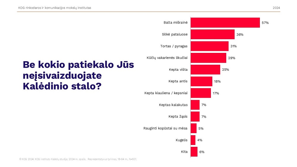 Pasak jos, kasmet nesikeičia ir tai, ką lietuviai deda ant Kalėdų stalo – karaliene vis dar išlieka balta mišrainė, kuria per šventes pasirūpina daugiau nei pusė apklaustųjų. Silkė pataluose yra antras pagal populiarumą patiekalas – be jos švenčių neįsivaizduoja 36 proc., be torto ar pyrago – 31 proc., Kūčių vakarienės likučių – 29 proc., keptos vištos – 25 proc., keptos anties – 18 proc., kiaulienos kepsnių – 17 proc., kepto kalakuto – 7 proc., keptos žąsies – 7 proc., raugintų kopūstų su mėsa – 5 proc., kugelio – 4 proc. apklaustųjų.