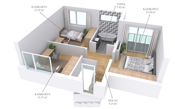Galimas II etapo įrengimas: iki dalinės apdailos, su daline apdaila ir su visiška apdaila.