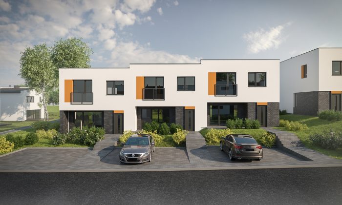 • 2 aukštų, 4 kambarių kotedžai, sublokuoti po du – 107 m2.