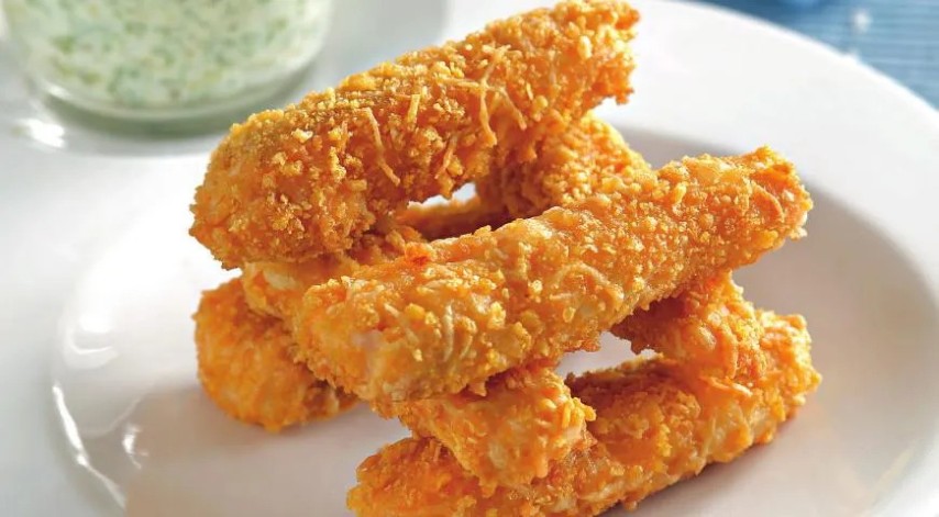 Reikės (4 porcijoms): 600–700 g lašišos filė be odos, 2 kiaušinių, 100 g kukurūzų dribsnių be cukraus, 4 šaukštų tarkuoto parmezano sūrio, miltų, druskos, šviežiai maltų baltųjų pipirų, lydyto sviesto arba aliejaus; padažui: 250 ml tiršto natūralaus jogurto, 5–7 konservuotų kornišonų, nedidelės saujelės krapų, 1 citrinos žievelės, 1 šaukštelio grūdėtų garstyčių, druskos, cukraus.