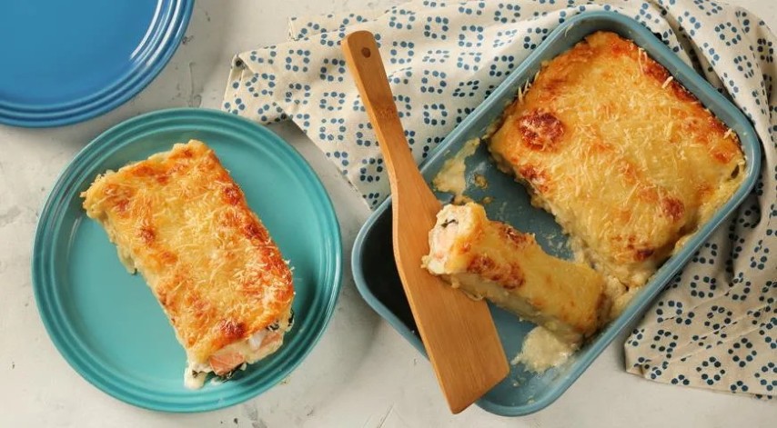Kepimo formą sutepkite sviestu. Ant lazanijos lakštų uždėkite po gabalėlį lašišos ir špinatų pagardo. Suvyniokite į vamzdelius ir dėkite į formą greta vienas kito. Tada padėkite į orkaitę, kol ta įkais iki 200 laipsnių.