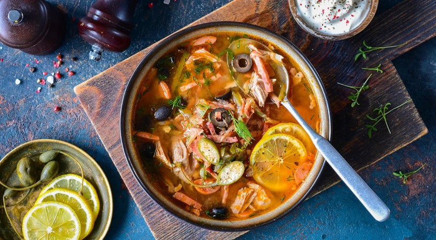 Reikės (6 porcijoms): 2 kg upėtakio, 300 g karštai rūkytos lašišos, 150 g silpnai sūdytos lašišos filė, 2 svogūnų, 1 petražolės šaknies, 2 salierų stiebų, 4 raugintų agurkų, 120 ml sūrymo nuo agurkų, 90 g konservuotų kaparėlių, 50 g trintų pomidorų, 1 šaukšto lydyto sviesto, 1 lauro lapo, 1 šaukštelio kvapiųjų pipirų žirnelių, druskos, maltų juodųjų pipirų; patiekti: citrinos, 3 krapo šakelių.
