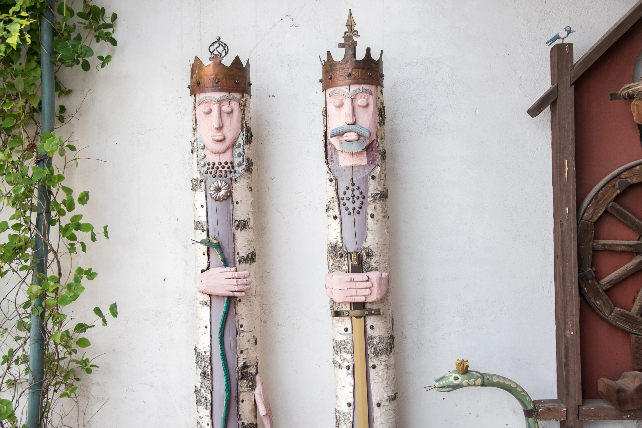 Prie pat šių istorinių asmenybių – žaltys. Pasak meistro, lietuvių mitologija be žalčių neįsivaizduojama – daugelyje pasakų, padavimų pasakojama apie šiuos gyvius. Net ir vesdamas į savo dirbtuves vyras juokais perspėja: yra keli žalčiai, saugokitės, kad neįkąstų.