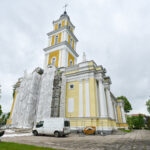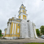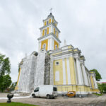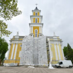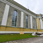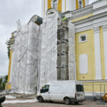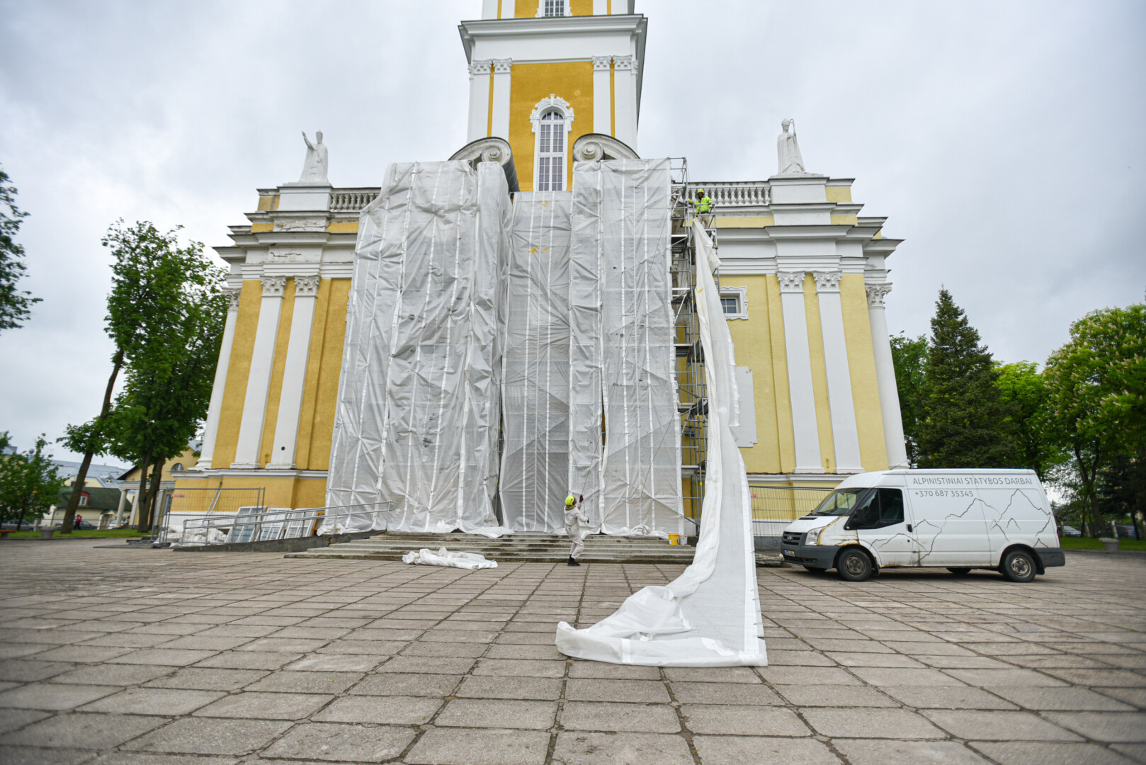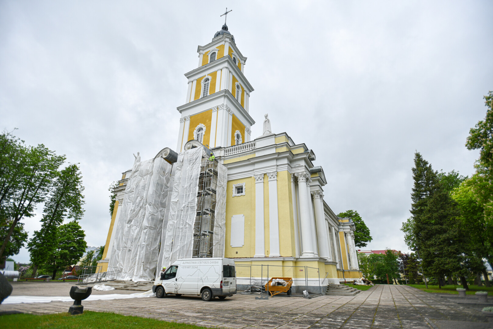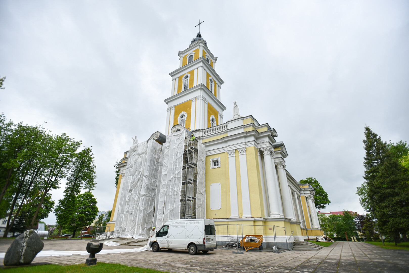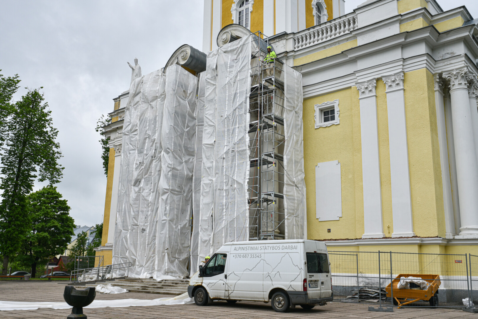Prie Panevėžio Kristaus Karaliaus katedros fasado ir bažnyčios viduje jau sumontuoti pastoliai.