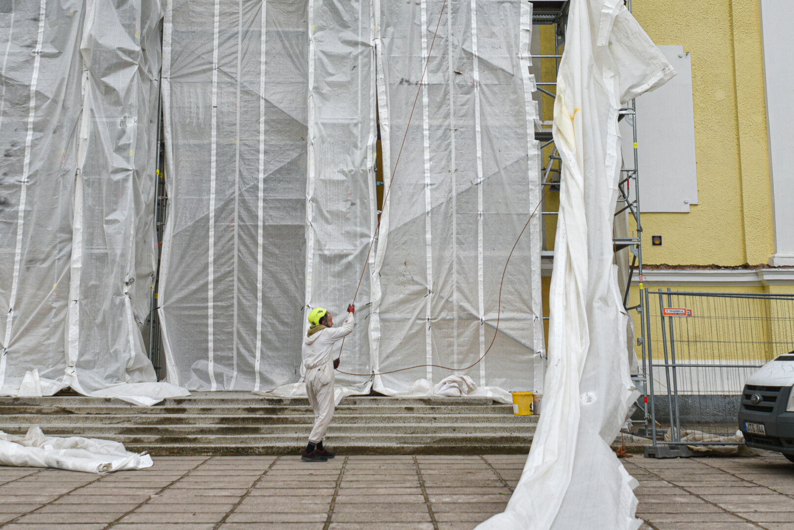 Vėliau savo eilės laukia ir bažnyčios šonai. Katedra po ilgų metų galiausiai vėl taptų vienodo geltono atspalvio.