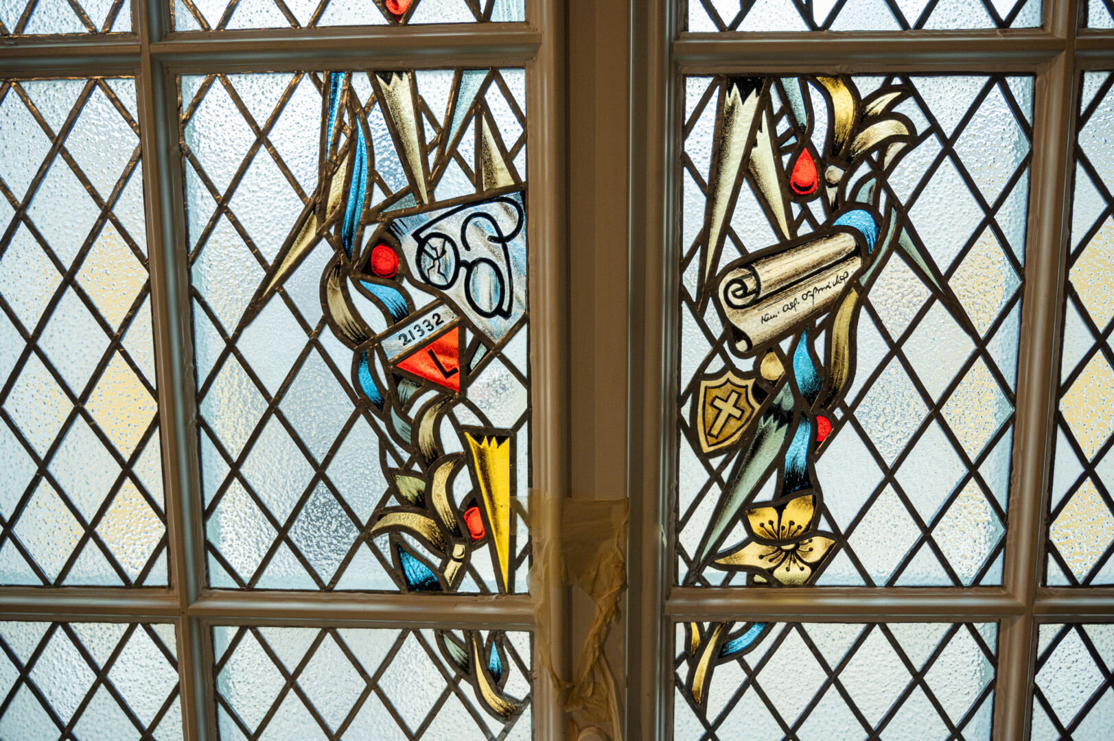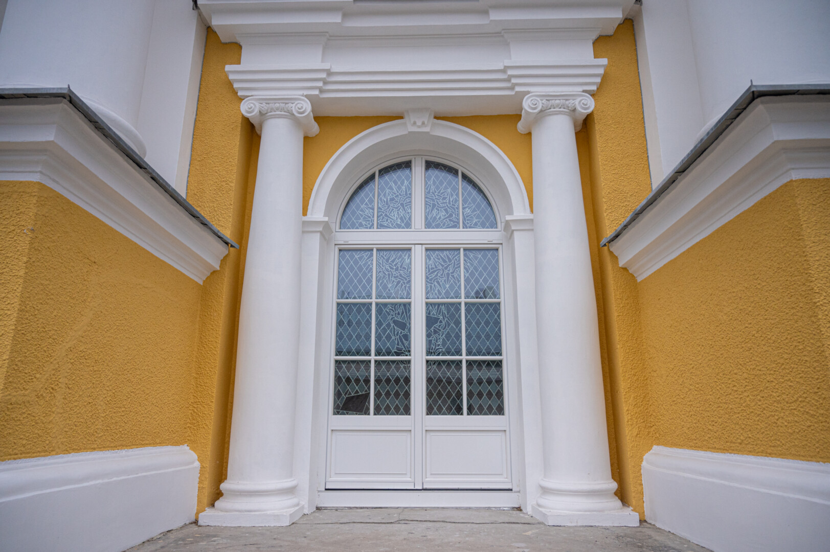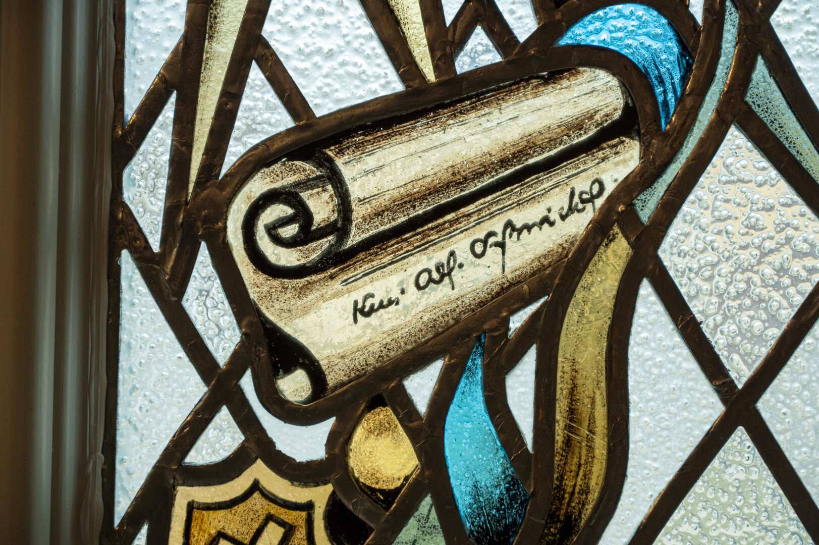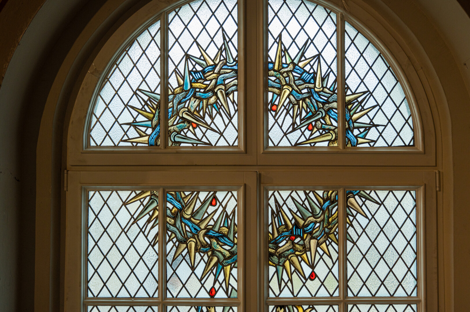 Anot jo, geltonai nudažyti parapijos namai prisidėjo prie vitražo grožio, mat juos atspindėdamas šis atrodo tarsi žėrintis auksu.