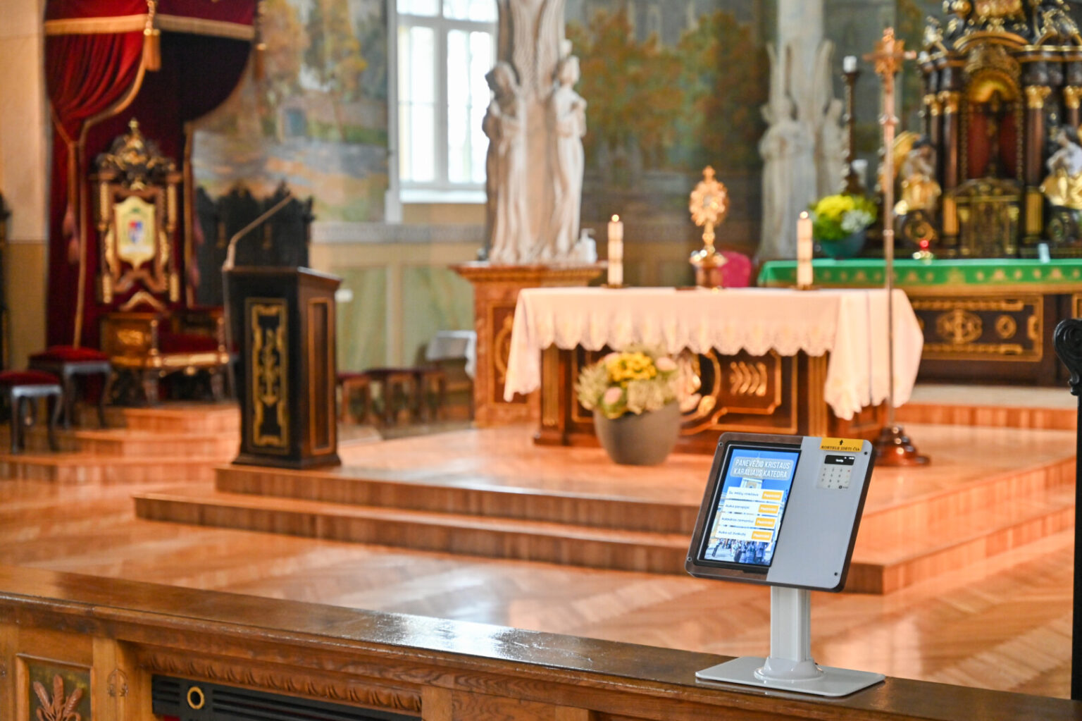 Naujovė Kristaus Karaliaus katedroje – prieš ketvertą mėnesių įrengtas bankomatas, kuriame galima aukoti banko kortele, kelią skinasi sunkokai.