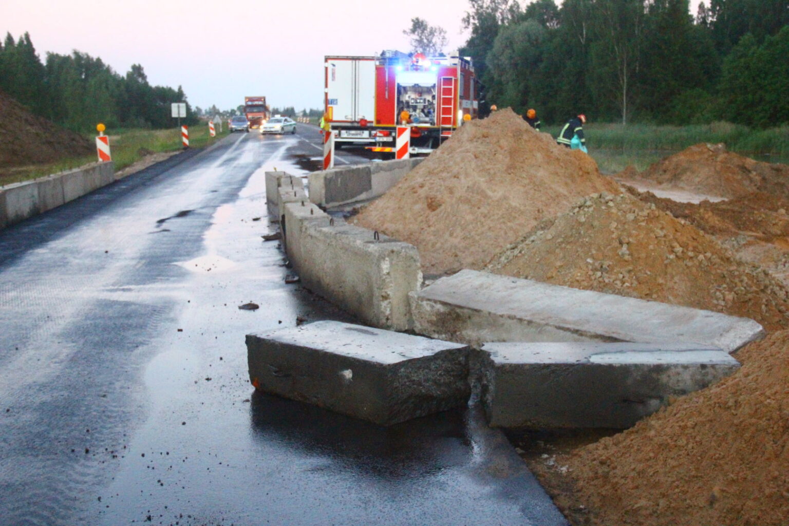 Dar viena avarija įvyko antradienio naktį Panevėžio aplinkkelyje, ties Paviečečių gyvenviete. Latvių vilkikas, gabenęs baldų krovinį iš Italijos, apakintas iš priekio atvažiuojančių mašinų, nepastebėjo kelio susiaurėjimo ir apie kelio taisymo darbus įspėjančių ženklų ir trenkėsi į betoninius atitvarus.