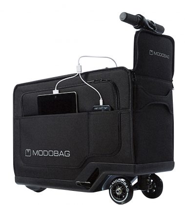 Jei norite tikrai išskirtinio lagamino, vertėtų atkreipti dėmesį į aistringo keliautojo, Čikagoje (JAV) gyvenančio verslininko Kevino O’Donnellio gaminį. Jo sukurtas „Modobag“ oro uoste gali pavėžėti nuvargusį keleivį. Įrengti pedalai, ištraukiama rankena-vairalazdė, stabdžiai. Motorizuoto kelioninio lagamino rėmas aliumininis, aptrauktas nailonine tekstile. Nedidelis, vos 32 cm, tačiau gana galingas – paveš ir 120 kg sveriantį šeimininką. Visiškai įkrauta baterija „Modobag“ gali nuvažiuoti apie 9 km ir pasiekti iki 12 km/val. greitį.