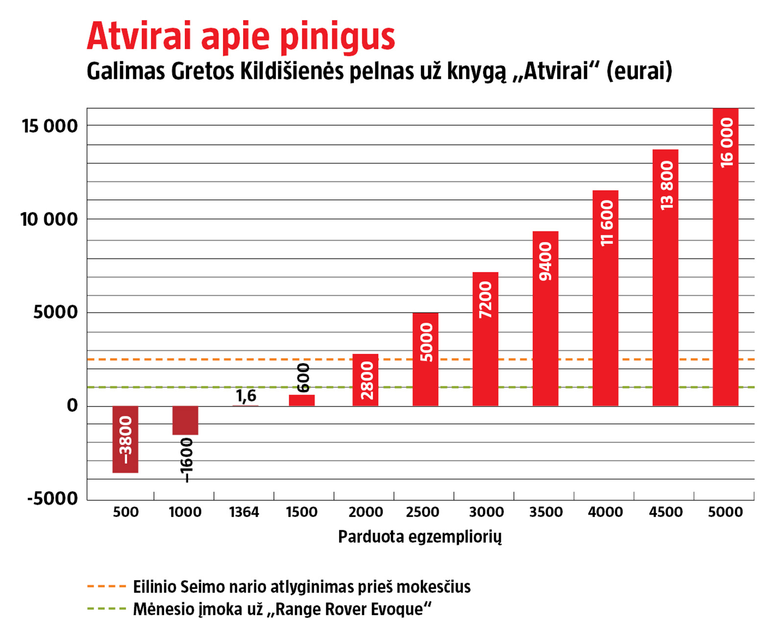 Knyga pirmą eurą pelno turėtų uždirbti, kai ją nupirks 1364-asis skaitytojas. Tai Lietuvos knygų rinkoje būtų geras rezultatas. Kai (jei) knygą įsigys 1592-asis pirkėjas, G.Kildišienės pelnas pasieks 1000 eurų – mėnesio įmokos už „Range Rover Evoque“, dėl kurio ir kilo parlamentarės postą jai kainavęs skandalas, dydį.