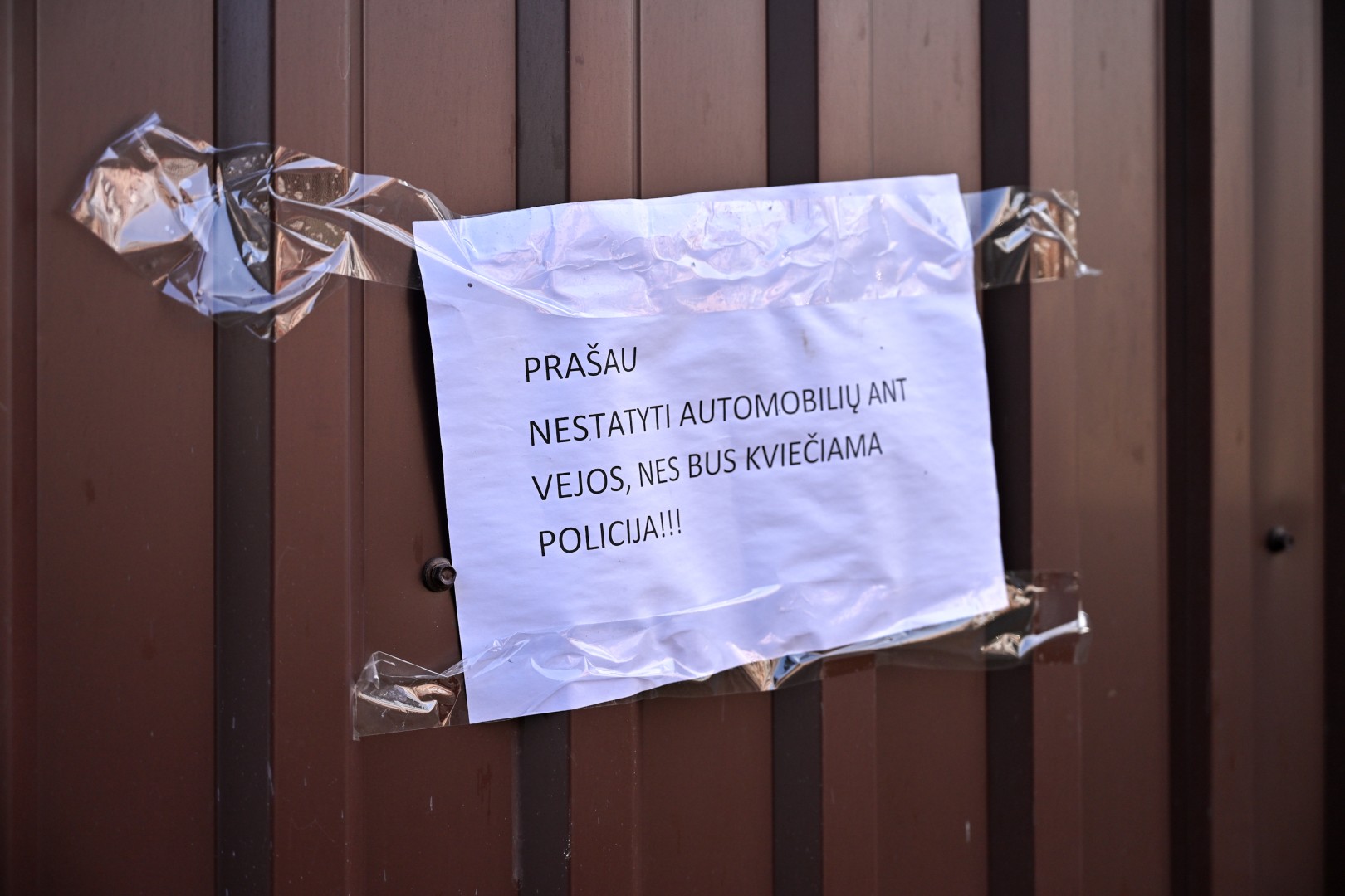 Ant namo balkonų, kiemo stulpų ir net tvoros po vienos nakties atsirado grėsmingi įspėjimai, kad užvažiavusieji ant vejos turės reikalų nebe su gyventojais, o policija.