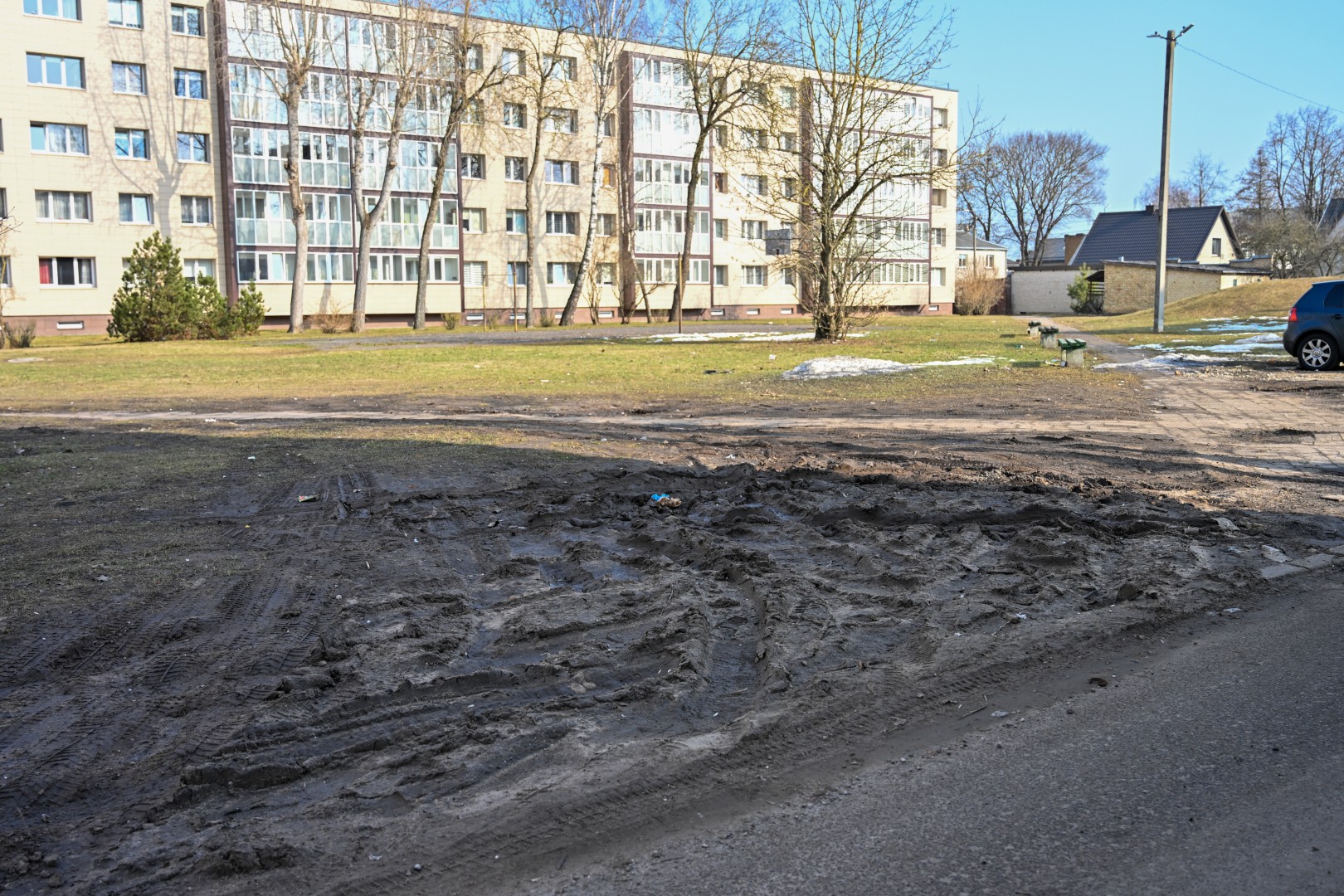 Beržų g. 21-ąjį daugiabutį supanti veja dar nėra itin išvažinėta.