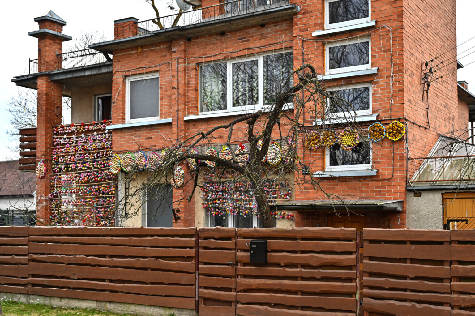 Panevėžietės Aldonos Ladavičienės namą Vydūno gatvėje jau beveik savaitę puošia tūkstančiai įvairiaspalvių margučių.