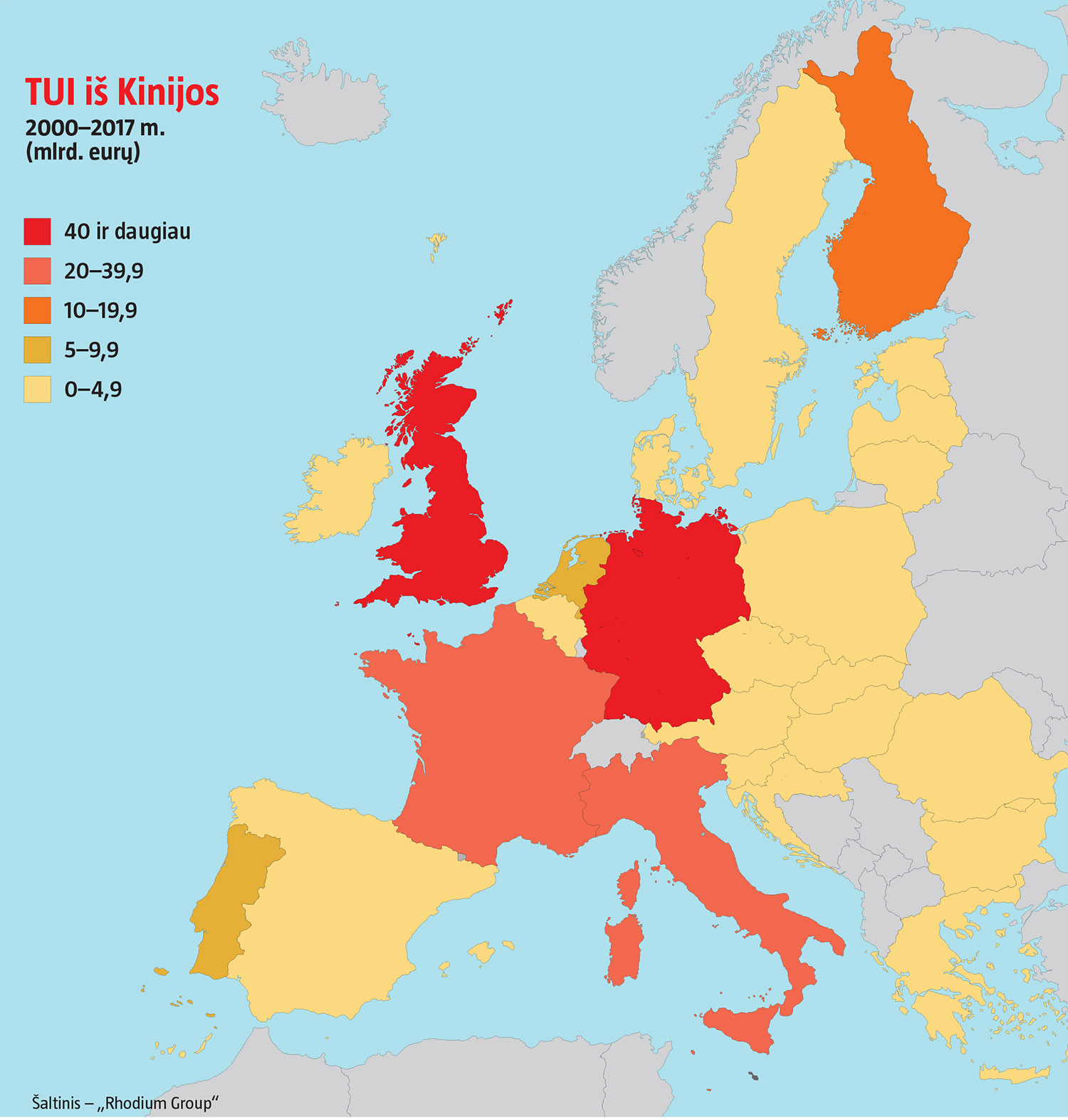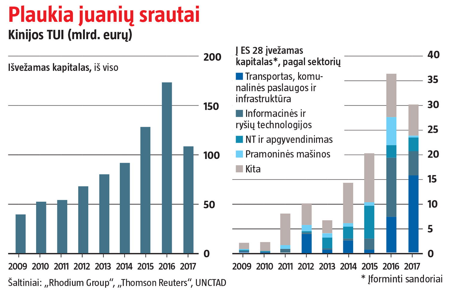 Kitur Europoje – taip pat. Amerikiečių tyrimų bendrovės „Rhodium Group“ duomenimis (žr. grafiką), 2016 m. kinai ES investavo beveik 36 mlrd. eurų, kai metais anksčiau – 20 mlrd. Už didumos investicijų stovi valstybė, kas rodo ambicingą Komunistų partijos siekį, kad Europa nepadėtų JAV riboti Kinijos augimo. Iki šio bumo Europos lyderiai, ypač vokiečiai, Kinijos investicijas daugiausia mielai priimdavo per daug negalvodami, bet kai suplaukė šitiek pinigų, Berlyne, Briuselyje ir kitur sunerimta dėl tokiu būdu stiprėjančios Kinijos galios ir įtakos, ypač mažesnėse ES šalyse. Kinijos investicijas pradėta griežčiau tikrinti, taip pat siekiama, kad Europa reaguotų vieningiau. Vis dėlto tokie bandymai vos spėja paskui pinigų srautus. Pernai įvežamų investicijų apimtis susitraukė iki 30 mlrd. eurų, Kinijai visame pasaulyje prisukus tiesioginių užsienio investicijų (TUI) čiaupą. Bet išaugo Europai tenkanti dalis – nuo penktadalio iki ketvirčio visų TUI.