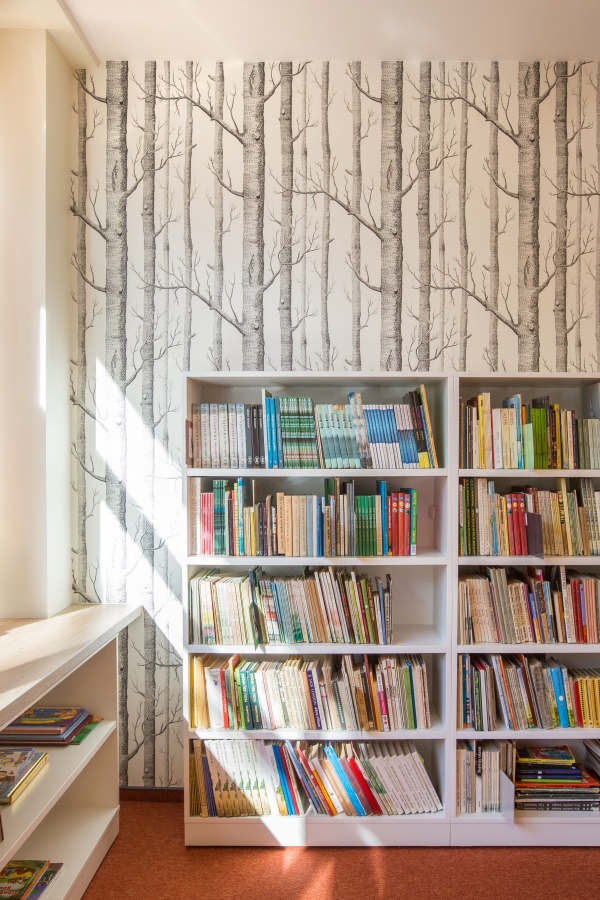 Medžiais dekoruotų tapetų, kurių raštas atkartoja vaizdą už lango, sienoje įrengta skaitymo vieta primena uoksą arba slėptuvę medyje.