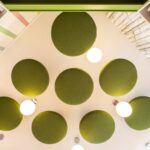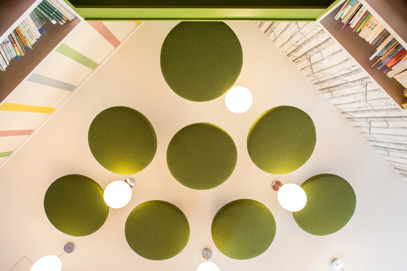 Iš aplinkos sklindančiam triukšmui prislopinti bibliotekoje įrengtos garsą sugeriančios lubos ir virš skaitymo vietos papildomai pakabintos dekoratyvios akustinės plokštės. Be pagrindinės funkcijos, žalios plokštės interjerui suteikia žaismingumo ir sumažina lubų aukštį. „Kai padariau sėdimą kampinę vietą, man pasirodė keista, kad išėjus iš to narvelio lubos iš karto smarkiai pakyla. Kai į erdvę žiūri 6–10 metų vaiko akimis, ji atrodo didelė. Būdamas mažas, tu nori mažesnės, jaukesnės aplinkos“, – akustinių plokščių atsiradimą motyvuoja projektuotoja.