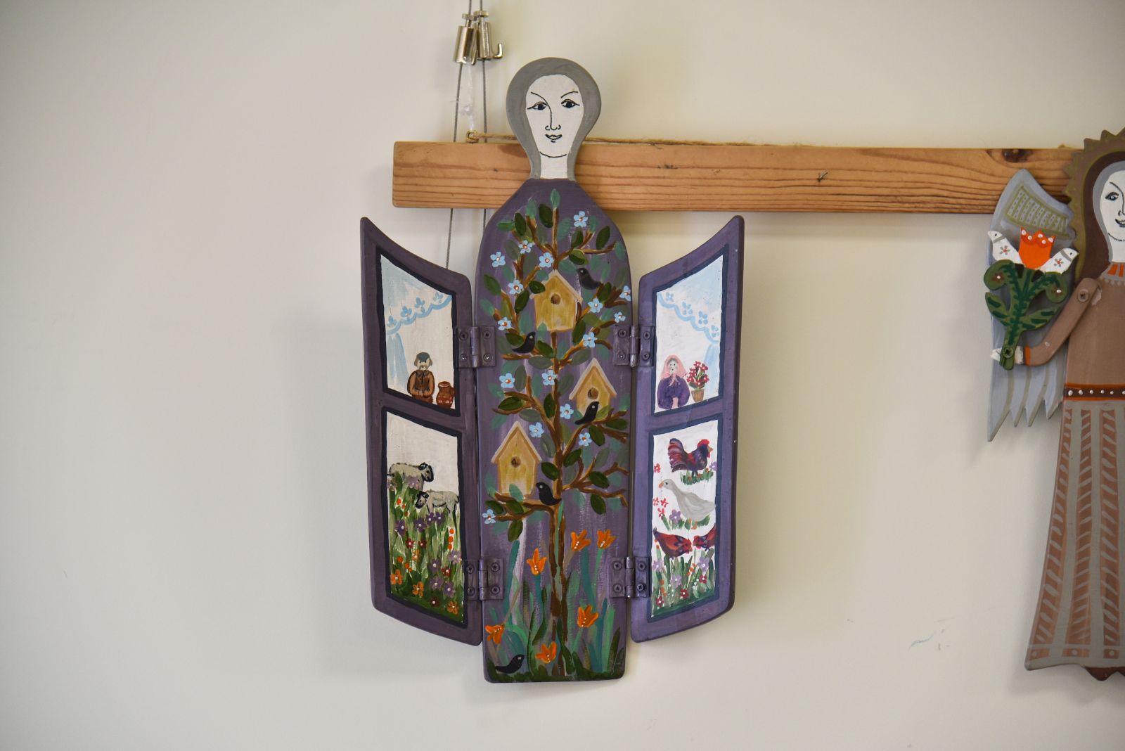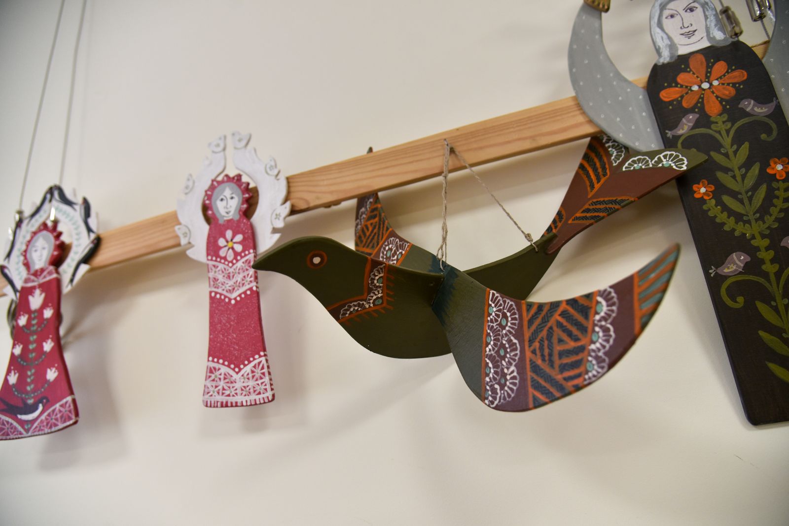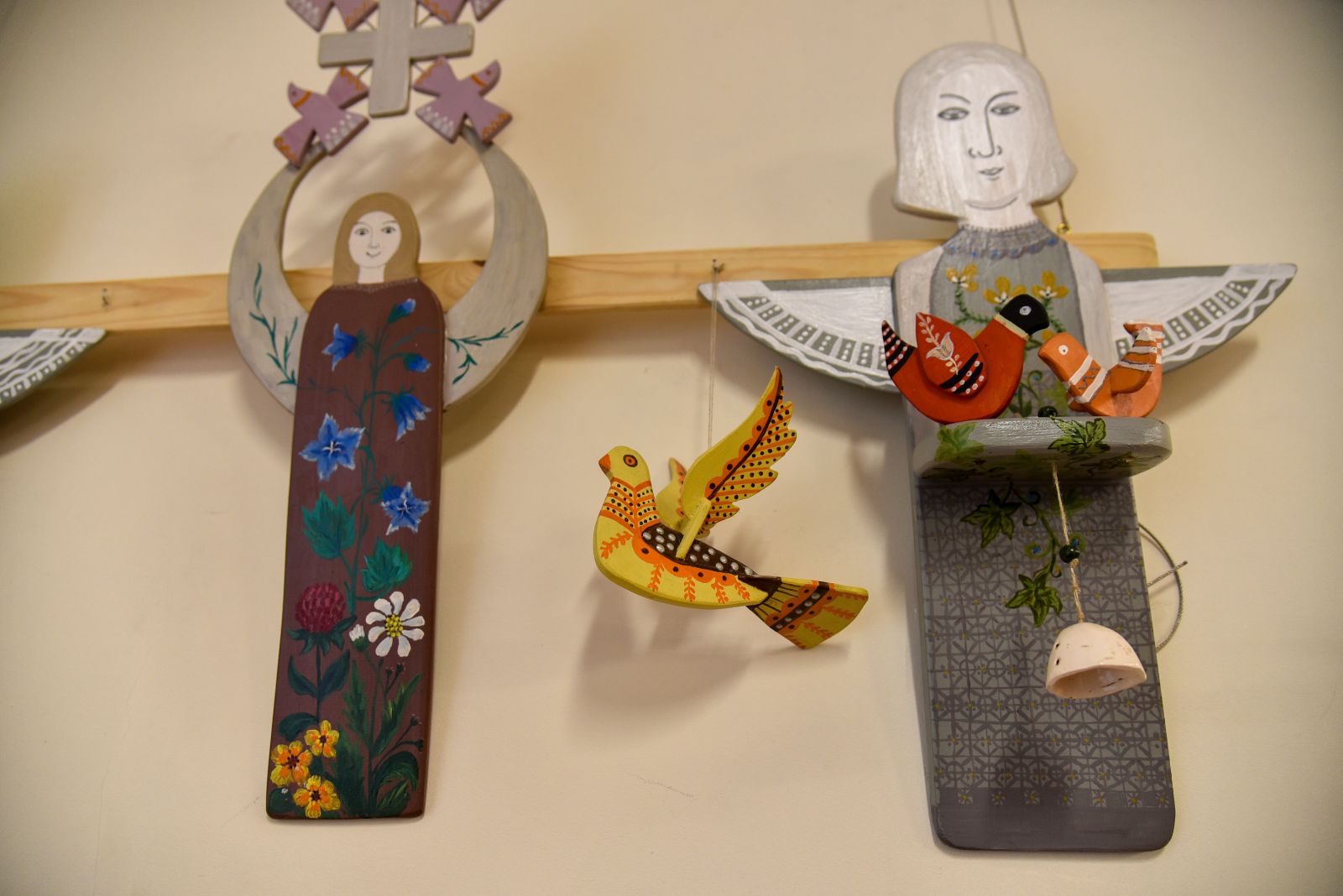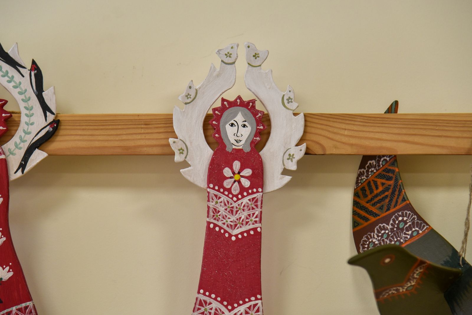 „Tapyti ant medžio sumaniau gana netikėtai – paprašiau vyro, kad pagal mano piešinius išpjaustytų iš faneros paukščių ir angelų figūras. Vyras mielai ėmėsi darbo“, – prisimena tautodailininkė.