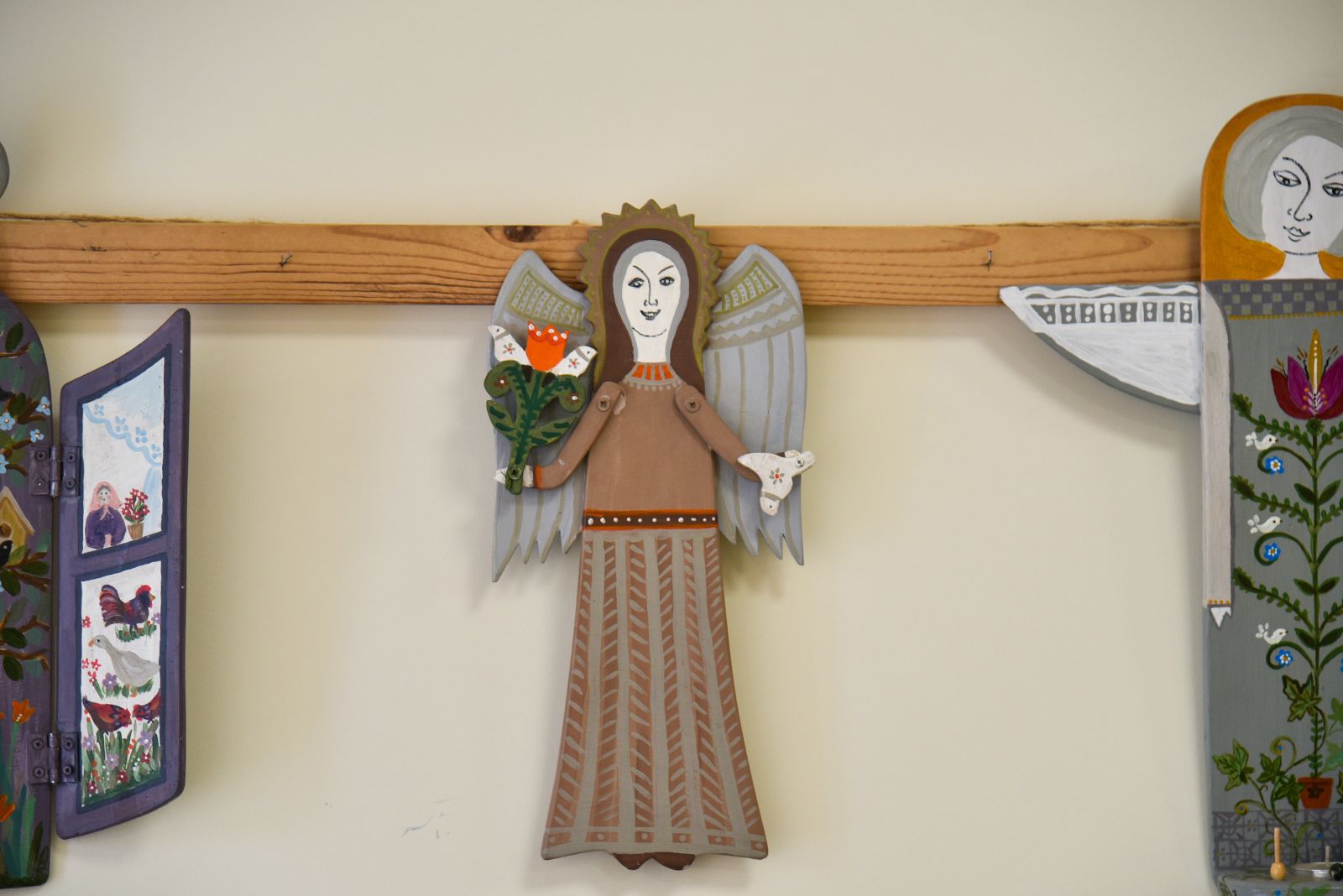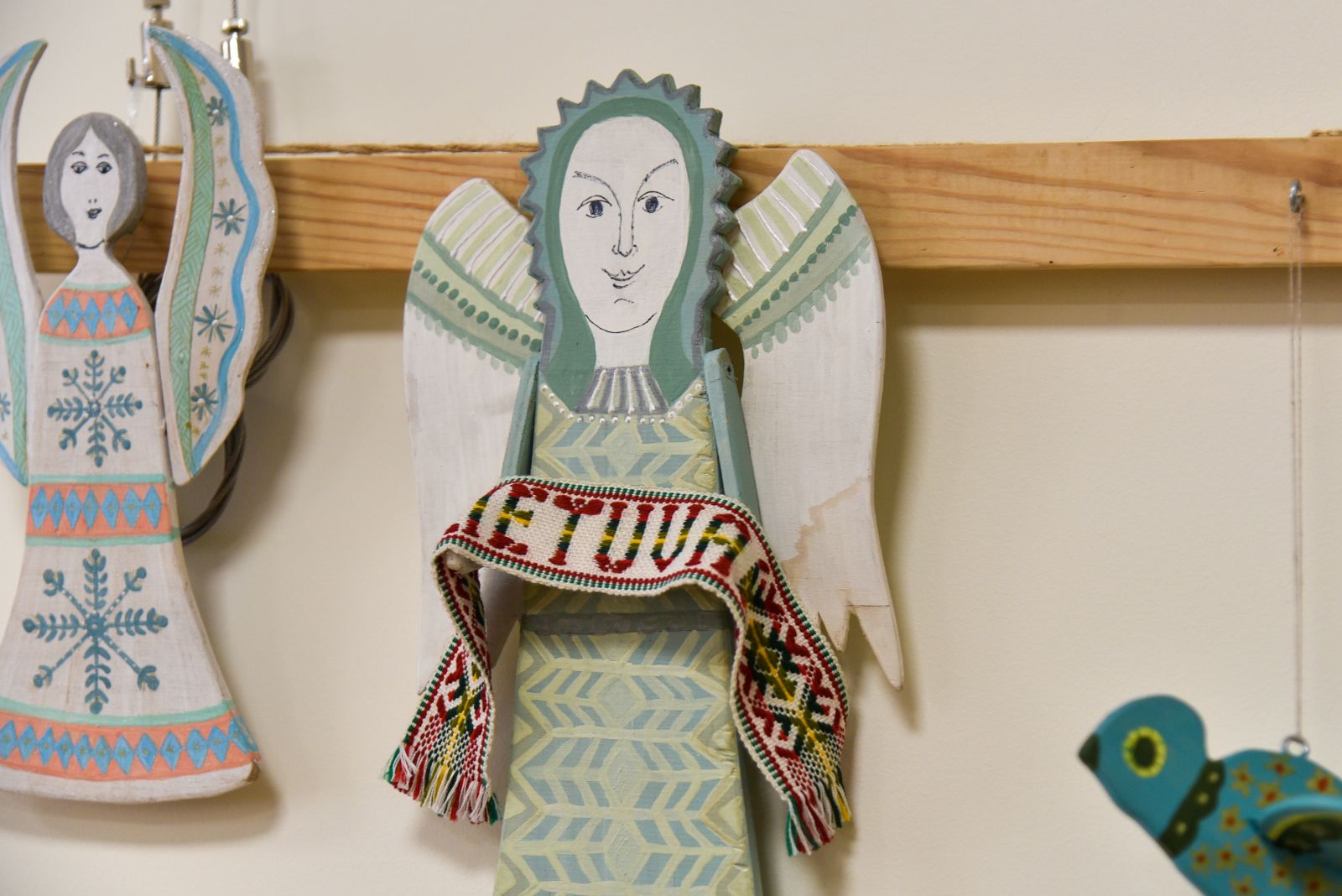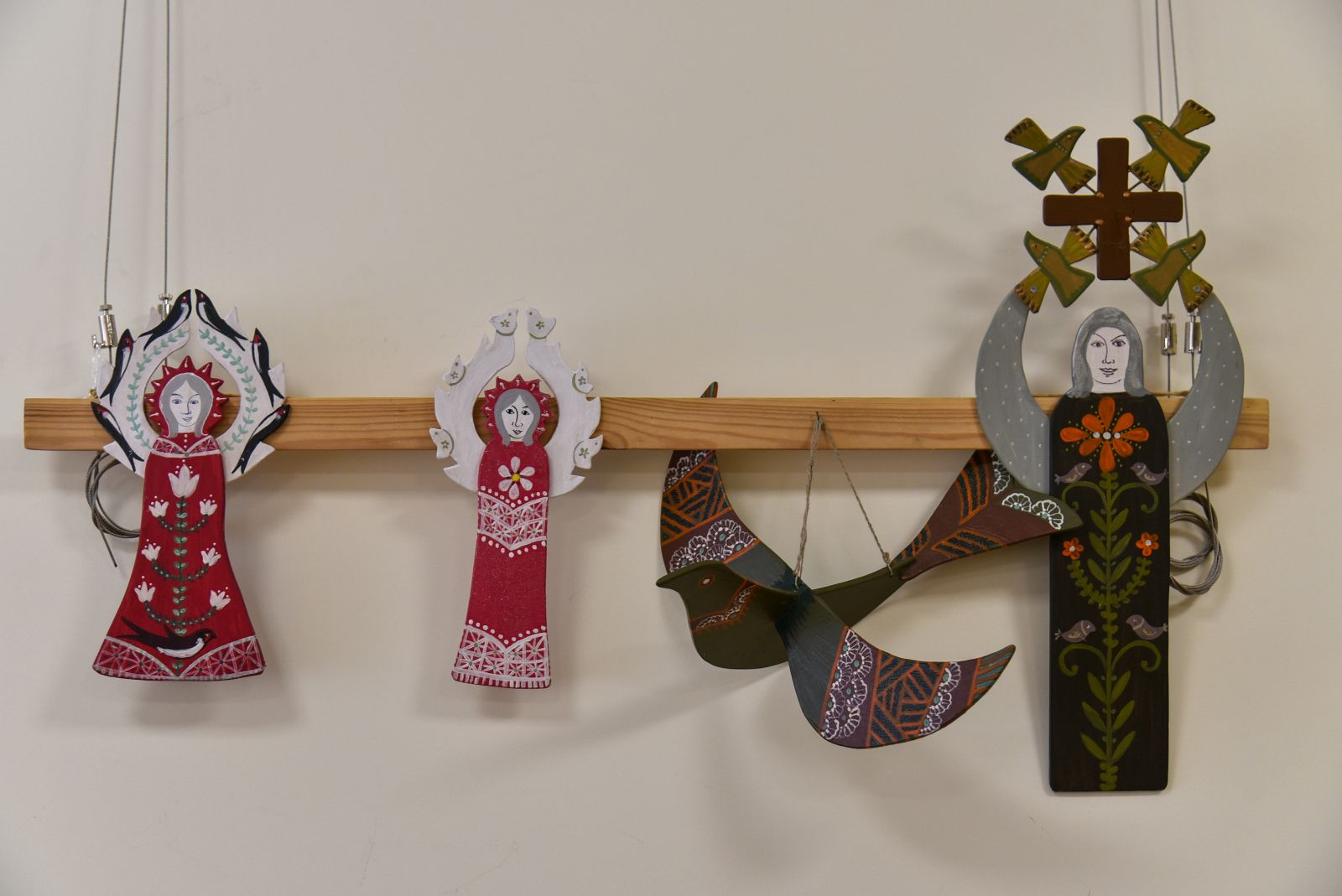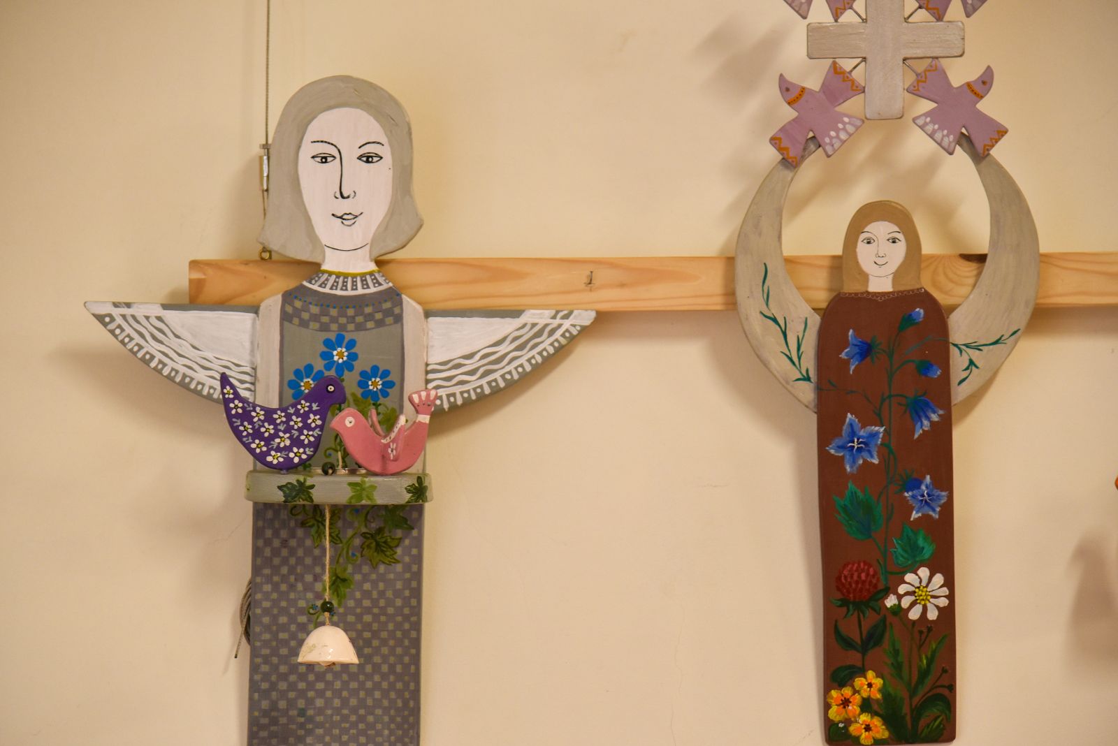 „Tapyti ant medžio sumaniau gana netikėtai – paprašiau vyro, kad pagal mano piešinius išpjaustytų iš faneros paukščių ir angelų figūras. Vyras mielai ėmėsi darbo“, – prisimena tautodailininkė.