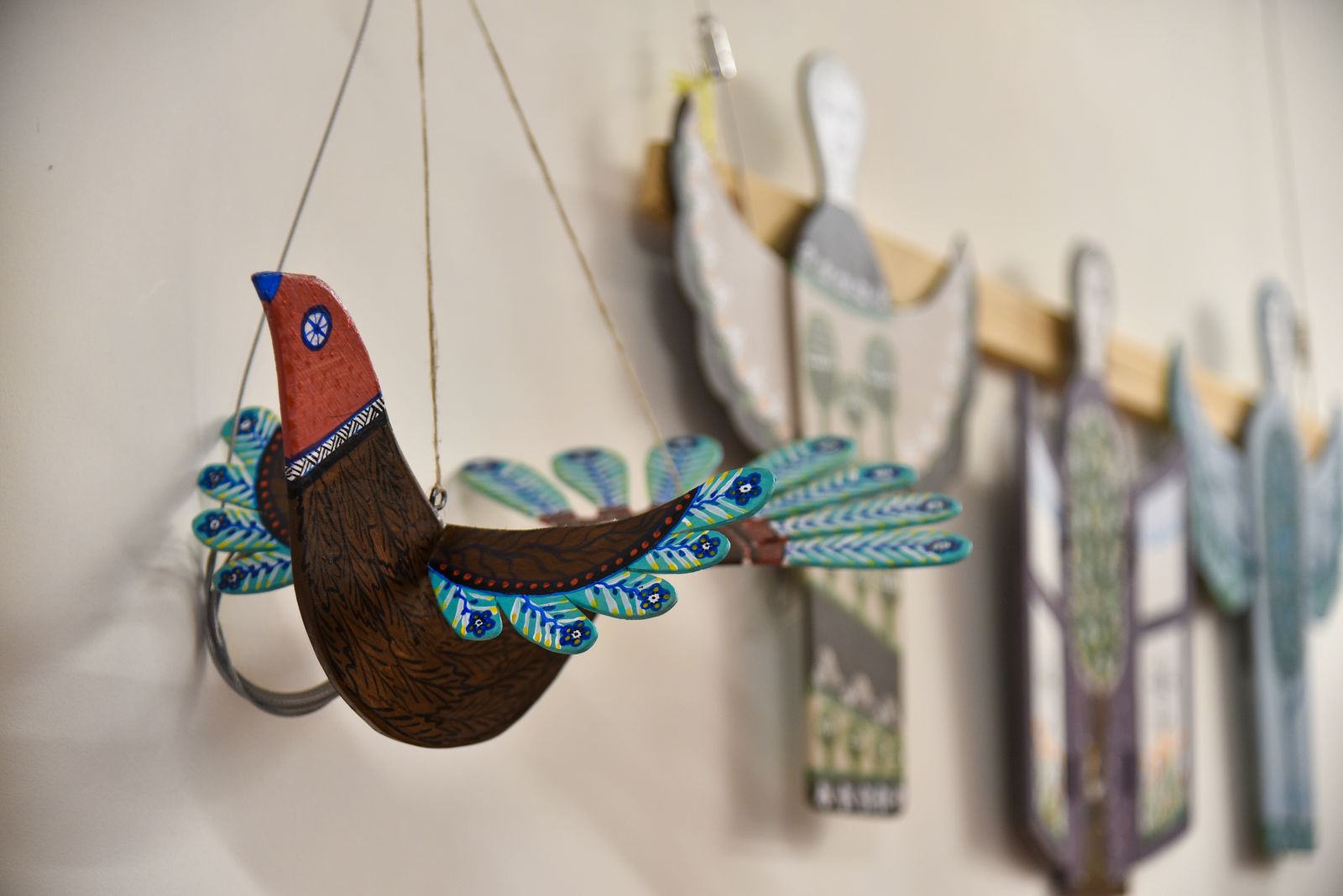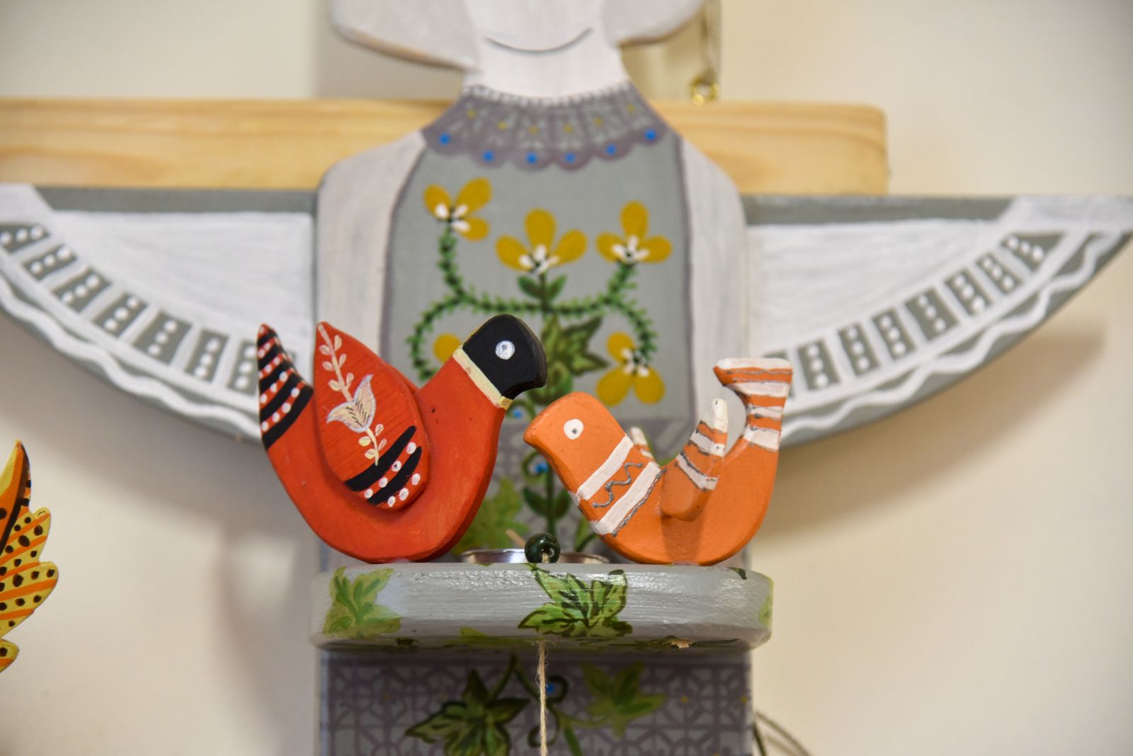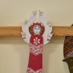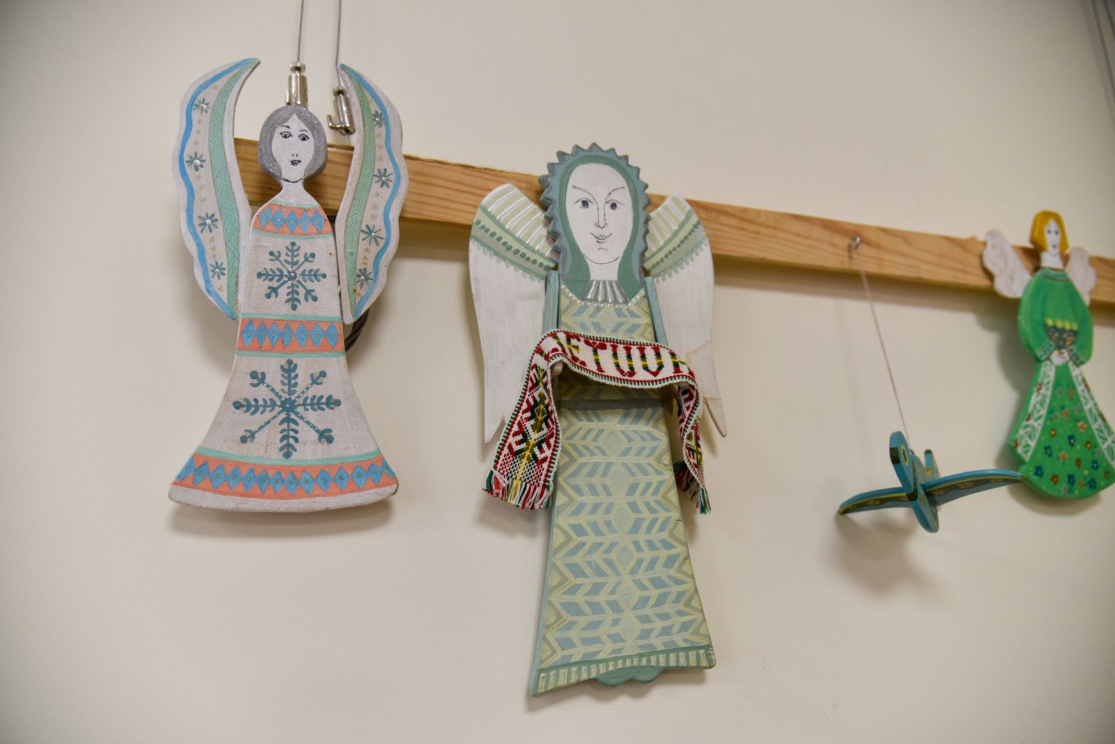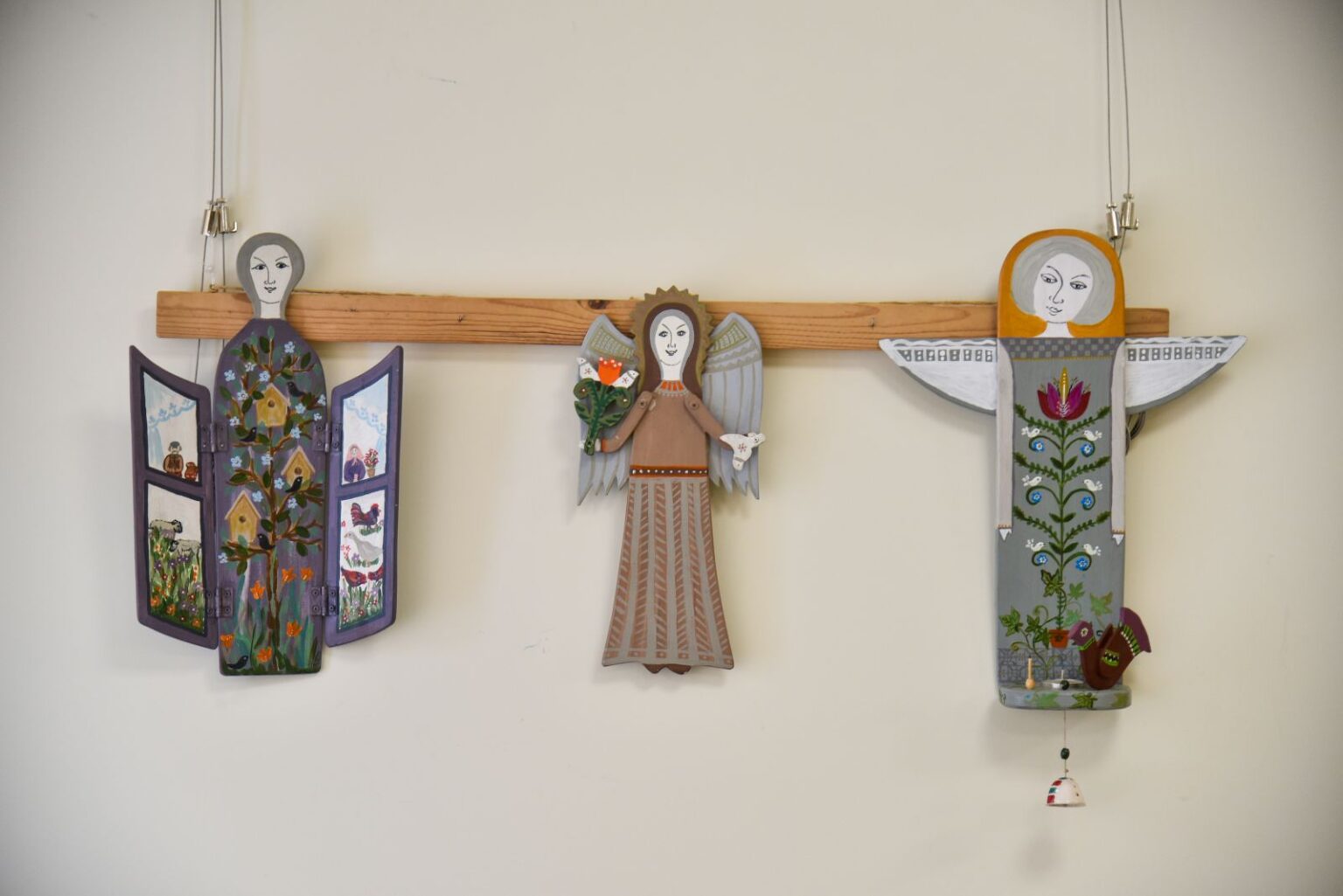 „Tapyti ant medžio sumaniau gana netikėtai – paprašiau vyro, kad pagal mano piešinius išpjaustytų iš faneros paukščių ir angelų figūras. Vyras mielai ėmėsi darbo“, – prisimena tautodailininkė.