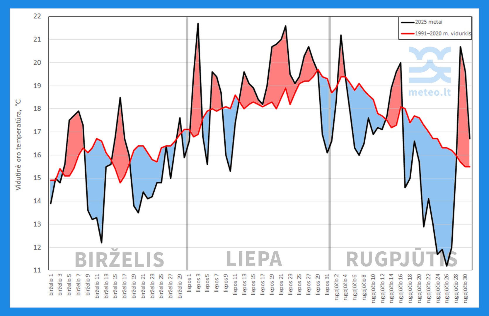 Šių metų rugpjūtis buvo reikšmingai vėsesnis nei įprasta. Jo vidutinė oro temperatūra Lietuvoje siekė 16,4 °C, tai yra 1,2 °C mažiau nei SKN (17,6 °C). Tai buvo antras vėsiausias XXI amžiuje rugpjūtis ir buvo šiltesnis tik už 2021 m. rugpjūtį (16,2 °C). Visi šių metų rugpjūčio dešimtadieniai pasižymėjo vėsesniais už SKN orais, ypač rugpjūčio III dešimtadienis (14,5 °C), kuris buvo net 1,8 °C vėsesnis nei įprasta (16,3 °C). Mažiausiu nuokrypiu nuo vidurkio pasižymėjo rugpjūčio II dešimtadienis (0,5 °C mažiau už SKN). Vėsesnį nei įprastą rugpjūčio I dešimtadienį (1,2 °C mažiau už vidurkį) lėmė rugpjūčio 4–6 d. Lietuvą pasiekę gilūs Atlanto ciklonai. Vėliau Centrinėje ir Rytų Europoje susidarė aukšto slėgio sritis, kuri Lietuvoje lėmė sausus bei artimus oro temperatūros daugiamečiam vidurkiui orus iki rugpjūčio 16 d. (išskyrus rugpjūčio 15 ir 16 d., kai į Lietuvą buvo trumpam įsiveržusi tropinės kilmės oro masė). Vėliau anticiklonas virš Baltijos regiono buvo išstumtas ir sustiprėjo anticiklonas virš Islandijos–Šiaurės jūros regiono, kuris lėmė šiaurinių krypčių vėsaus oro pernašą Lietuvoje. Tačiau nuo rugpjūčio 28 d. įvyko staigus oro atšilimas, dėl seno, gilaus Atlanto ciklono prie Britų salų, kuris sukūrė pernašą nuo Pietvakarių Europos link Šiaurės Rytų.