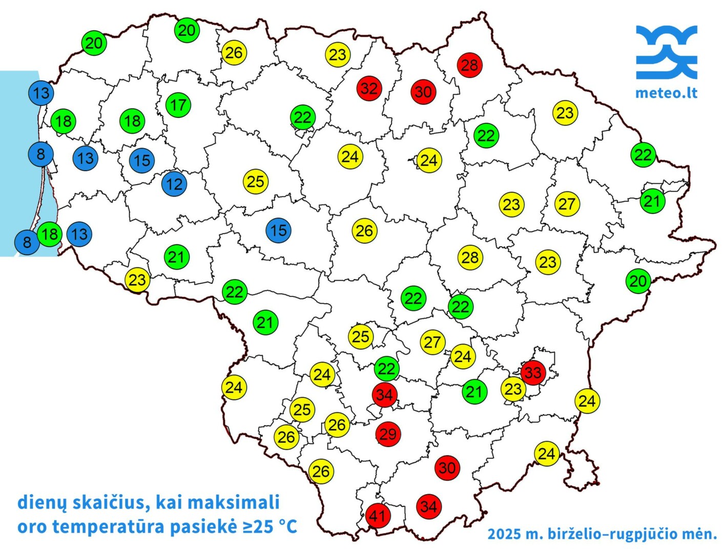Grafike – 2025 m. vasaros (juoda kreivė) ir 1991–2020 m. (raudona kreivė) laikotarpio vidutinė oro temperatūra Lietuvoje. Raudona spalva rodo šiltesnius, o mėlyna – šaltesnius už daugiametį vidurkį laikotarpius.2025 m. vasaros sezono kritulių kiekis Lietuvoje vidutiniškai siekė 275,6 mm, o tai yra 20 % daugiau už vasaros SKN (229 mm). Nors šių metų vasara buvo išties lietinga, tačiau ji 1,7 mm kritulių nusileido 1978 m. vasarai ir todėl nepateko tarp 10 lietingiausių vasarų nuo 1961 m. (užėmė 11 vietą iš 65). Birželis buvo drėgnesnis už daugiametį vidurkį, o rugpjūtis – sausesnis. Tačiau drėgnumu ypač išsiskyrė liepa (iškrito net 168 % liepos kritulių normos), kuri buvo 3 drėgniausia liepa nuo 1961 m. Jog vasara buvo drėgna indikuoja ir tai, jog visą vasarą bent dalyje Lietuvos teritorijos (daugiausia šalies rytuose) buvo fiksuojamas gan retas (Lietuvoje vidutiniškai fiksuojamas kas 10-us metus) stichinis meteorologinis reiškinys – „ilgas lietingas laikotarpis“, kuris indikuoja ypač ilgai trunkantį perteklinio drėkinimo laikotarpį.