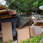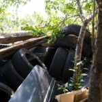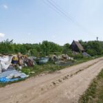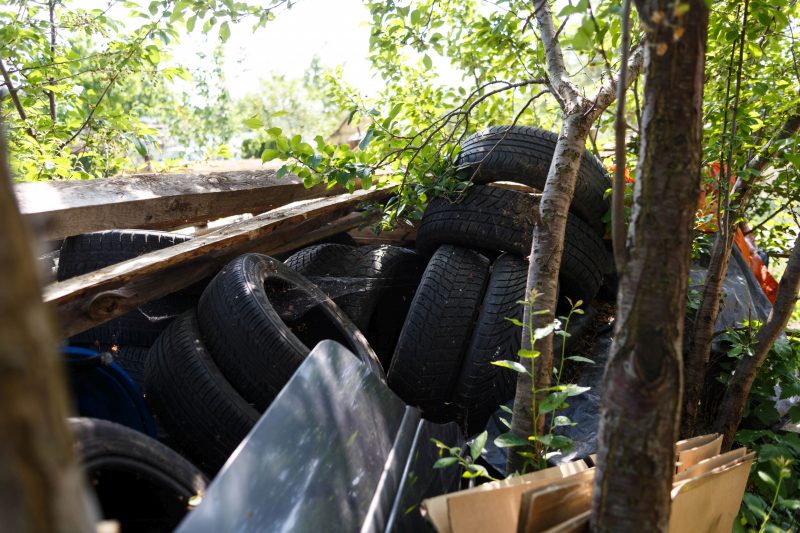 Namo sienas iš išorės ramsto malkos, senos lentos, langų rėmai, surūdijusios metalinės detalės ir daugybė padangų. Jos sukrautos net ant stogo, o dar bene kelios dešimtys guminių ratų suversta ir visoje sklypo teritorijoje. Čia taip pat matyti naudotų plytų krūvos ir labai daug senų kuro talpyklų, kurios uždarytos karštyje kartas nuo karto supyška.