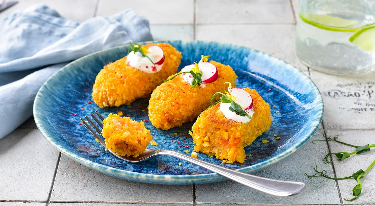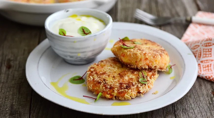 Reikės (4 porcijoms): 400 g morkų, 300 g bulvių, 200 g svogūnų, 4 česnako skiltelių, 80 g tirštos sorų košės, 15 g kukurūzų krakmolo, aliejaus gruzdintuvei, druskos, šviežiai maltų juodųjų pipirų; padažui: 125 g natūralaus jogurto, 100 g „Provansalio“ majonezo, 120 g žalumynų (petražolių, bazilikų, krapų, svogūnų laiškų), 4 česnako skiltelių, druskos.