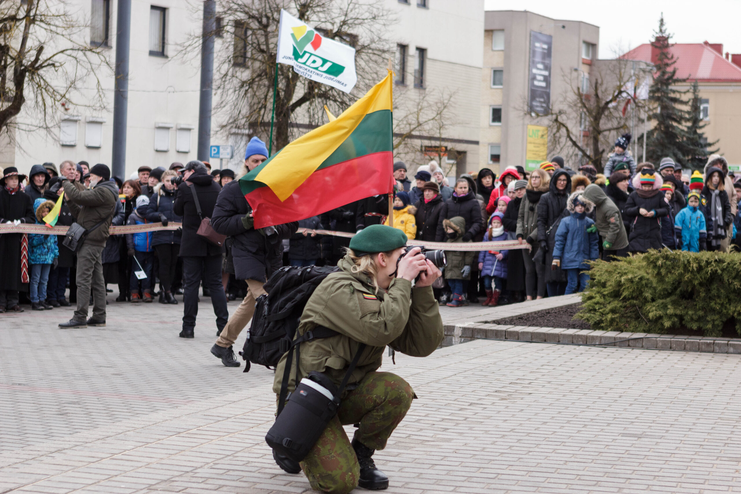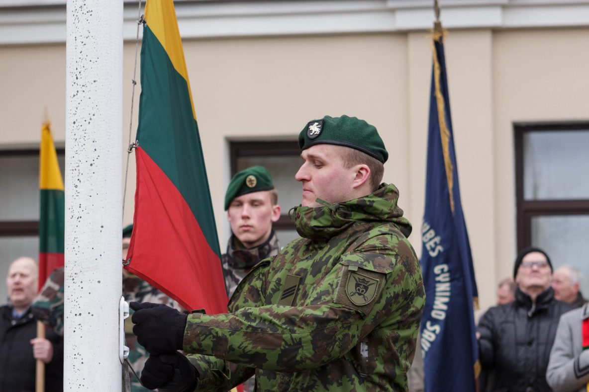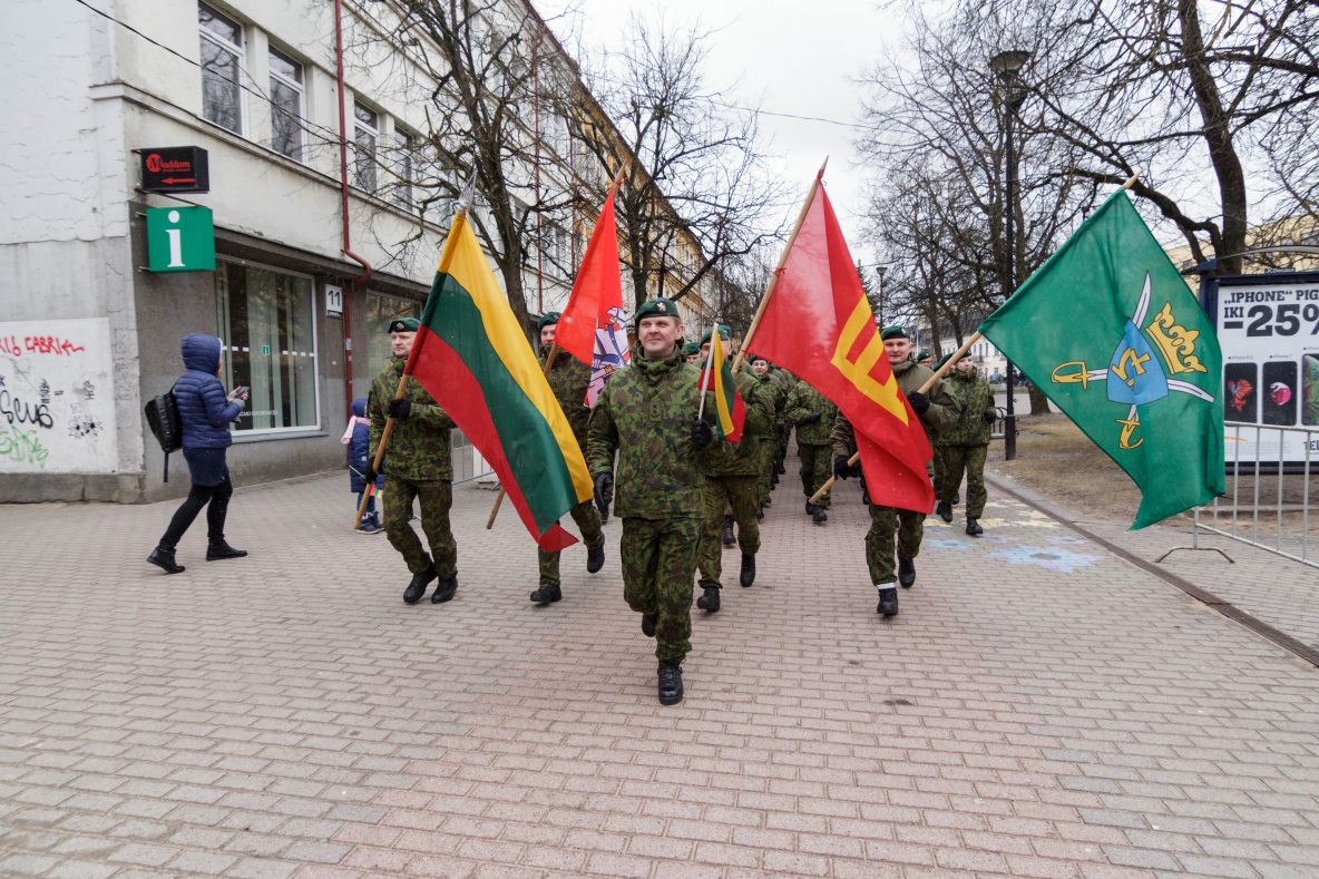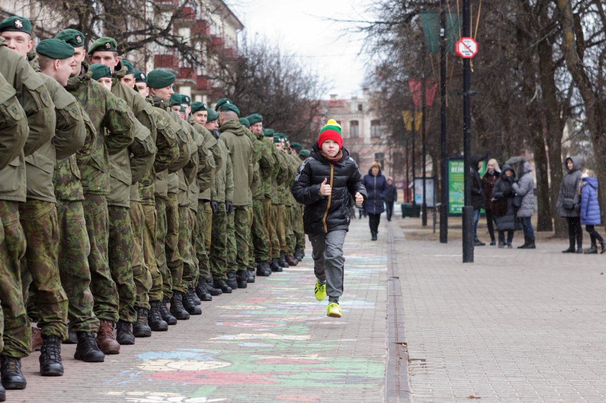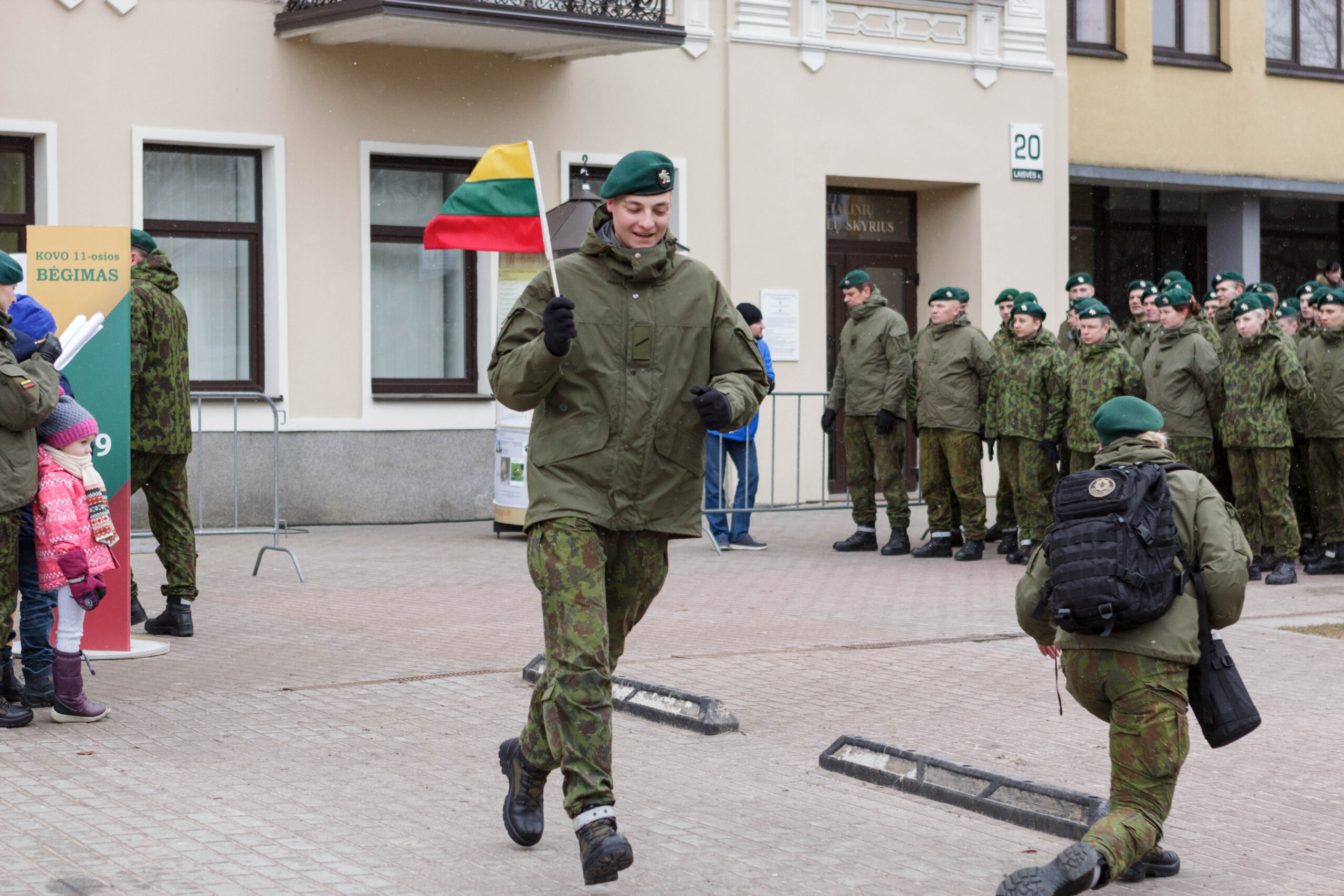 Paskutinieji Laisvės aikštę apibėgo kariai – iš karto po jų bėgimo prasidėjo iškilminga vėliavos pakėlimo ceremonija.