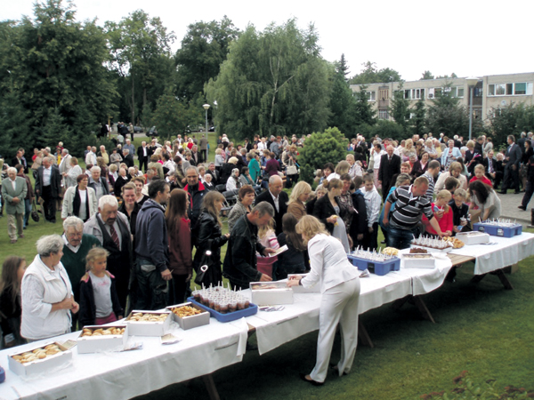 Taigi po šv. Mišių visi susirinkusieji pasuko į tą pusę, kur grojo šiaudinėmis skrybėlėmis pasipuošusi bendruomenės kapela: Romas Sutkus, Henrikas Užtupas, Rimantas Bitinas, Česlovas Gnižinskas ir Vytautas Šaknys. Kol visi perėjo per iškilmingus vartus, vyrai trenkė iš peties. Vyresnio amžiaus žmonės ir tie, kurie atėjo pirmi, patogiai įsitaisė ant ką tik nupirktų kėdžių, kiti – ant suolų, dar kiti stoviniavo aplinkui.