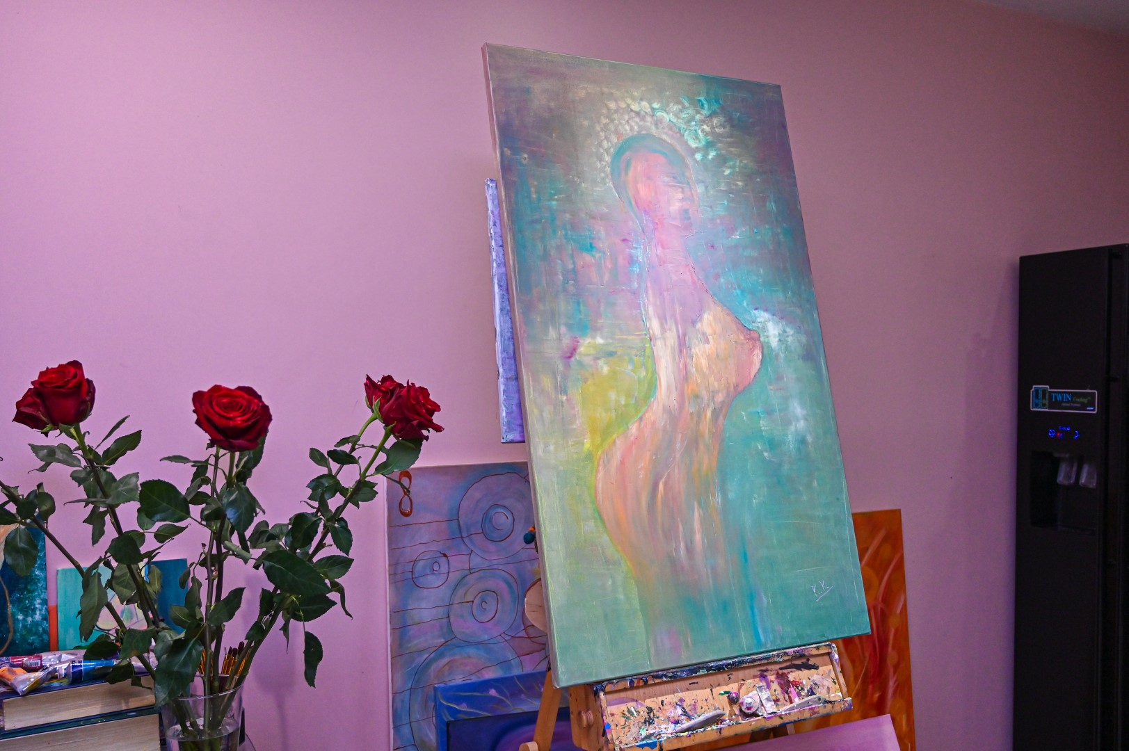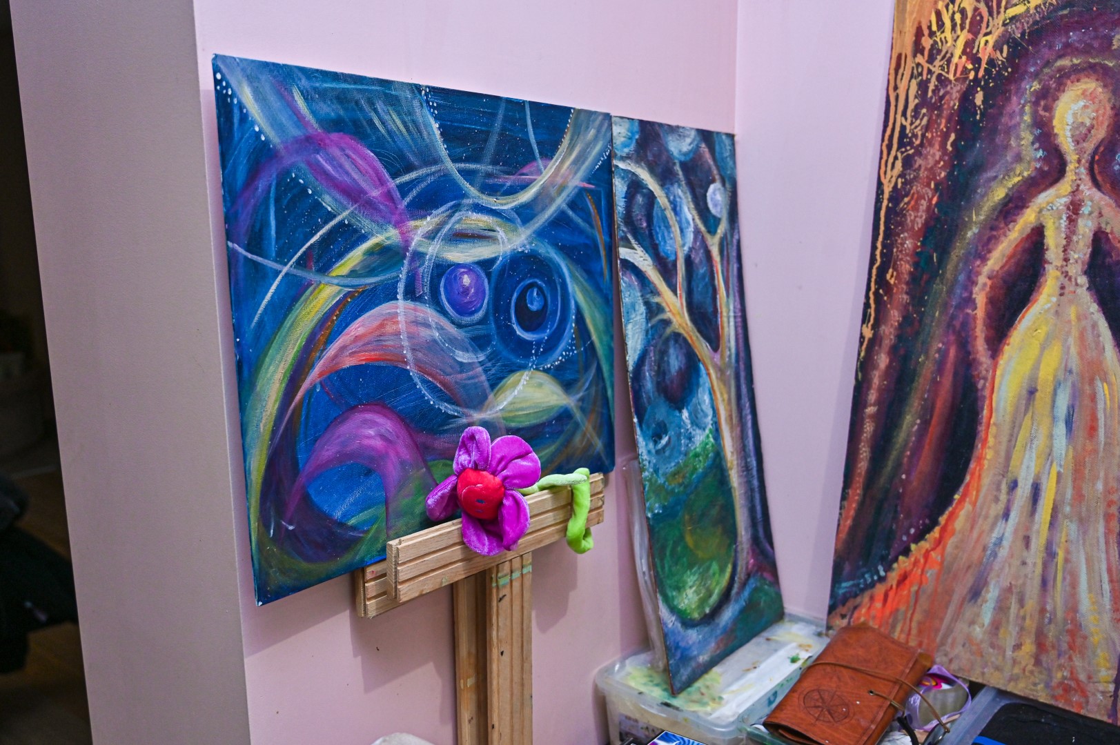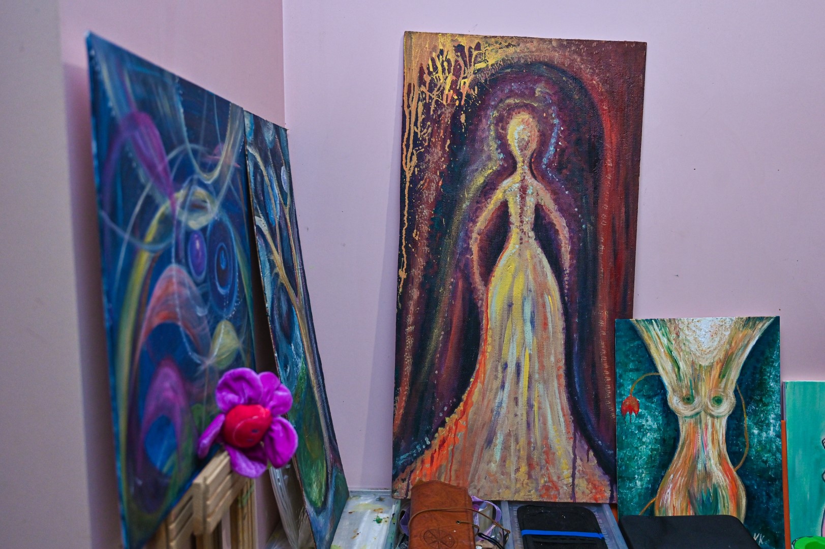Studijoje netapydavau. Visada tik namuose. Man reikia saugios savo erdvės. Tapyba man yra terapija. Prieš paimdama teptuką, užsidegu žvakes, smilkalus, įsijungiu meditacinę muziką. Man reikia, kad tada nieko nebūtų aplinkui.